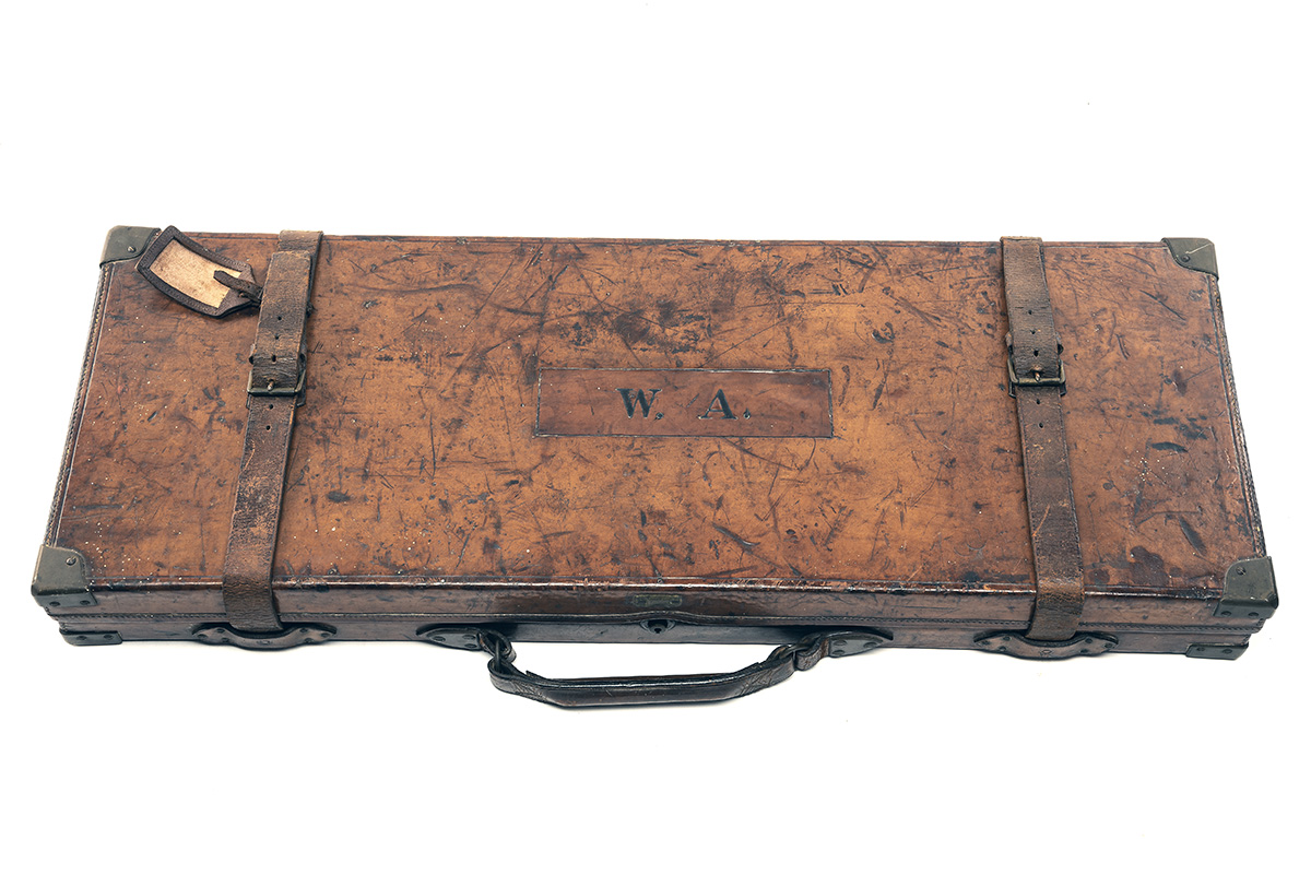 fitted for 30in. barrels, the interior lined with red baize (some moth damage), brass push-button lock (key missing), the lid exterior embossed with 'W.A.'