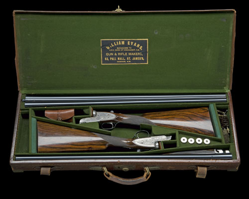 30in. nitro barrels, ribs gold-inlaid '1' and '2' and engraved 'WILLIAM EVANS, 63, PALL MALL, ST. JAMES'S, LONDON.', No.1 with slight pitting, No.2 bore measurements marginal, 2 1/2in. chambers, bored approx. 1/4 and 1/2 choke, treble-grip actions with removable striker discs, automatic safeties with gold-inlaid 'SAFE' details, toplevers gold-inlaid '1' and '2', Evans patent non-selective single triggers, best bold acanthus scroll engraving, retaining slight traces of original colour-hardening, 14 1/2in. replacement stocks with ink-enhanced figuring, weight 6lb. 8oz., in its brass-cornered leather case with some accessories