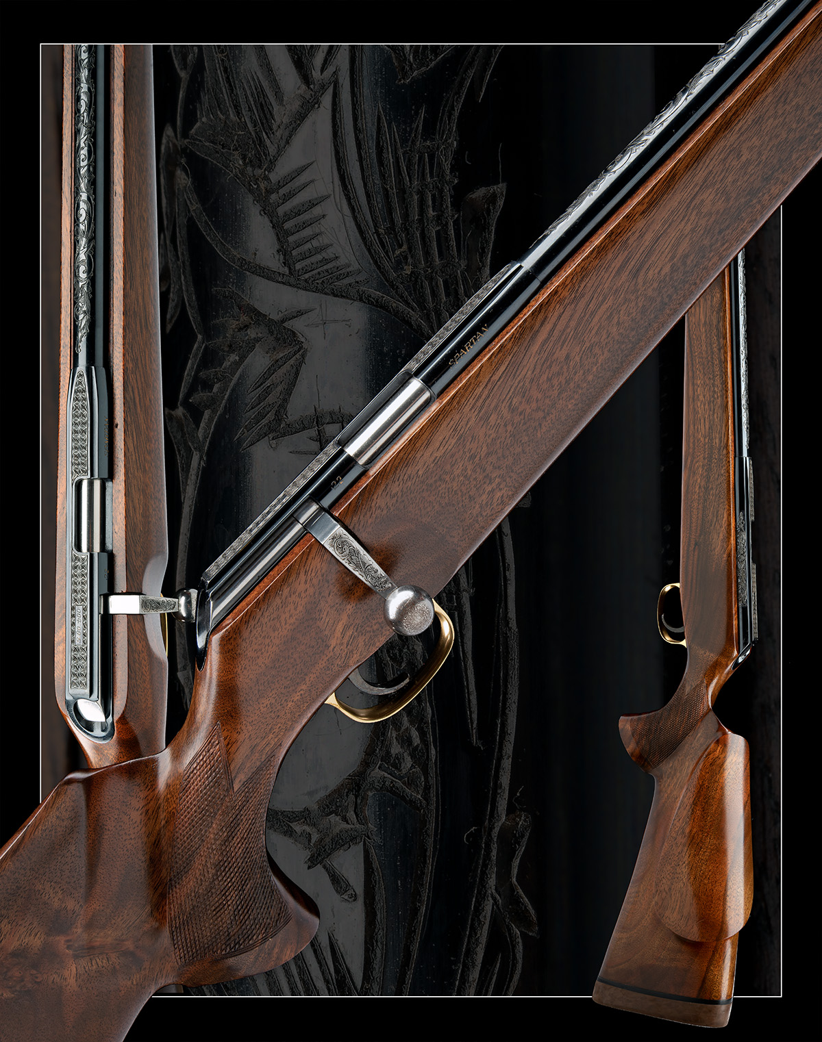 circa 2008, with mirror-blued and tapering 25in. barrel engraved along the full length of the upper surface with bold acanthus scrolls by Don Blocksidge, twin gold bands at muzzle, blued bolt-action receiver with integral rail for a telescopic sight engraved with geometrics within a borderline panel, the left side of the receiver with a further panel of bold acanthus scrollwork, in the white highly polished turned down bolt-handle engraved with scrolls, figured walnut anatomical right hand half-stock chequered at the grip and fitted with a stippled rubber heel-pad, colour hardened trigger blade within a lacquered brass trigger-guard, brass-lined aperture for filling probe near fore-end tip (probe included) and barrel mounted eyelet for a bipod (absent), light marks only to wood otherwise appearing little used and complete in a fitted full-length Browning rifle case