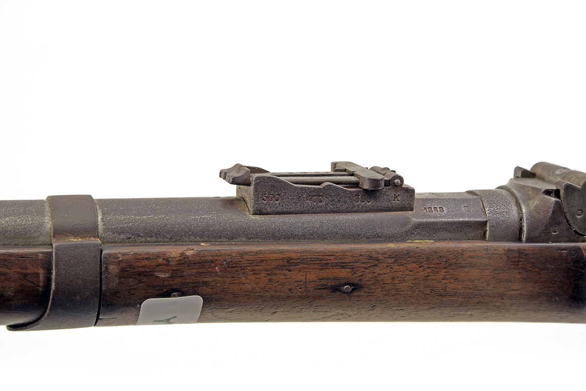 AN 11X50mmR SERVICE-RIFLE, UNSIGNED, MODEL 'M1853/67' ALBINI-BRAENDLIN, serial no. 4673, with 34 5/8in. barrel dated '1868', rear-sight with Halkin modification, regulation three-quarter stock and iron mounts, with provision for clearing rod (missing), some wear and surface pitting throughout.