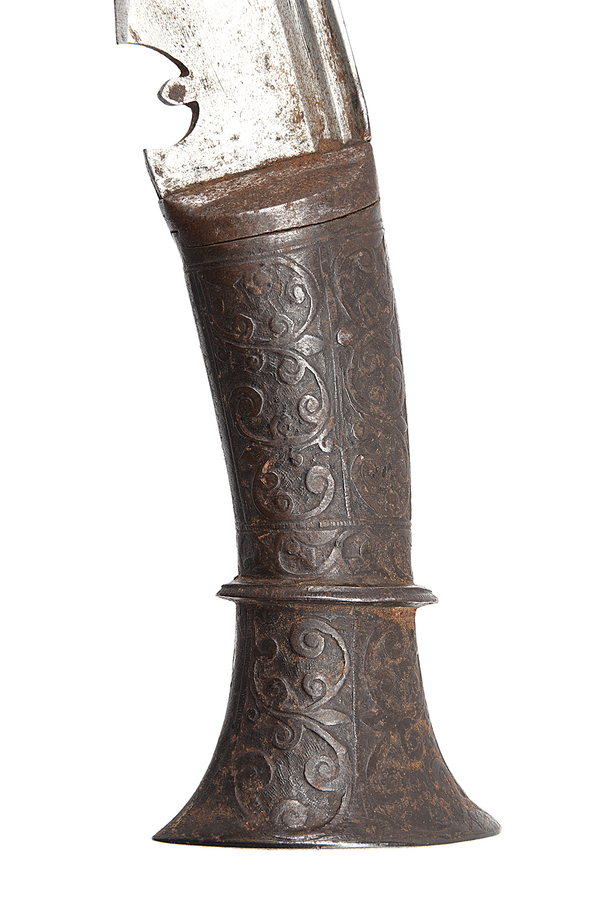 both circa 1890 and Northern Indian or Nepalese, the first with slender curving 14in. blade (some discolouration), prominent 'T' shape to the first half of the back edge, iron mount to the front of the moulded horn grip, in its soft leather scabbard with woven detail and embossed white metal mounts; together with two wood hilted probably unassociated bi-knives in a rear-mounted pouch; the second with 11 1/2in. curving blade, engraved iron hilt and velvet covered wood scabbard (scabbard worn)