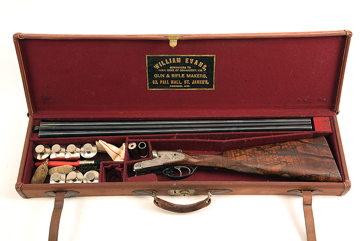 WILLIAMS EVANS 12-BORE SIDELOCK EJECTOR, serial no. 16559, 28in. nitro barrels, the rib engraved 'WILLIAM EVANS. 63. PALL MALL. AT. JAMES'S. LONDON.', 2 1/2in. chambers, bored approx. true cyl and 1/4 choke, some pitting, treble-grip action with removable striker discs, automatic safety with gold-inlaid 'SAFE' detail, partially engraved with fine acanthus scrollwork with beaded bordering, brushed bright and reblued finish overall, 15 1/4in. well-figured replacement stock with matching replacement fore-end wood, weight 6lb. 13oz., in a canvas and leather case with William Evans trade label and with seven nickel oil bottles, some hand etched with details of contents