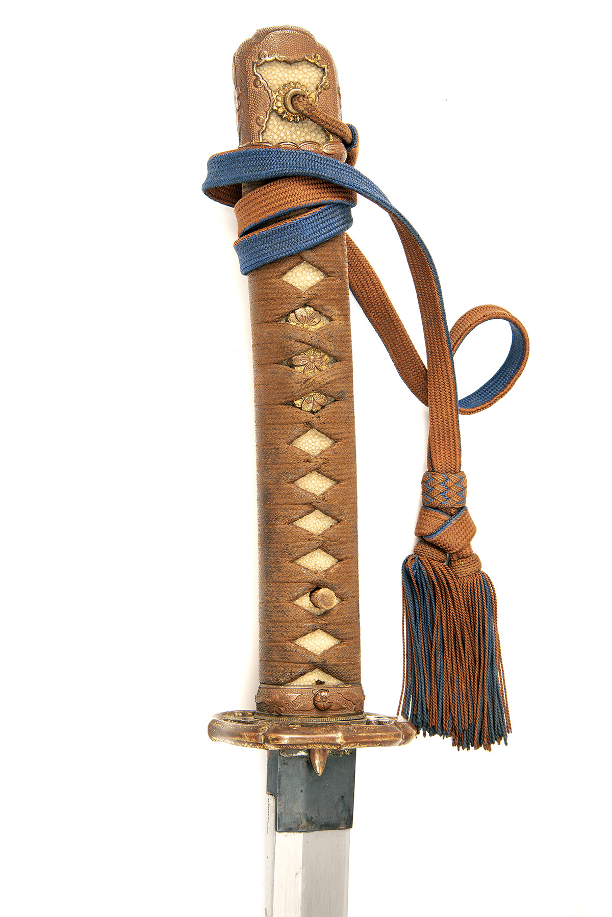 with 25 3/4in. 'shinshinto' blade signed on both sides of the tang, visible narrow straight 'hamon' extending around the 'kissaki', blacked silver alloy 'habaki' with raised matted silver panel pierced with a family mon, single 'mekugi-ana' to the tang, general officer quality military mounts including pierced 'tsuba' (traces of gilding to all), and leather covered 'saya', complete with its sword knot (rank equivalent of Major)