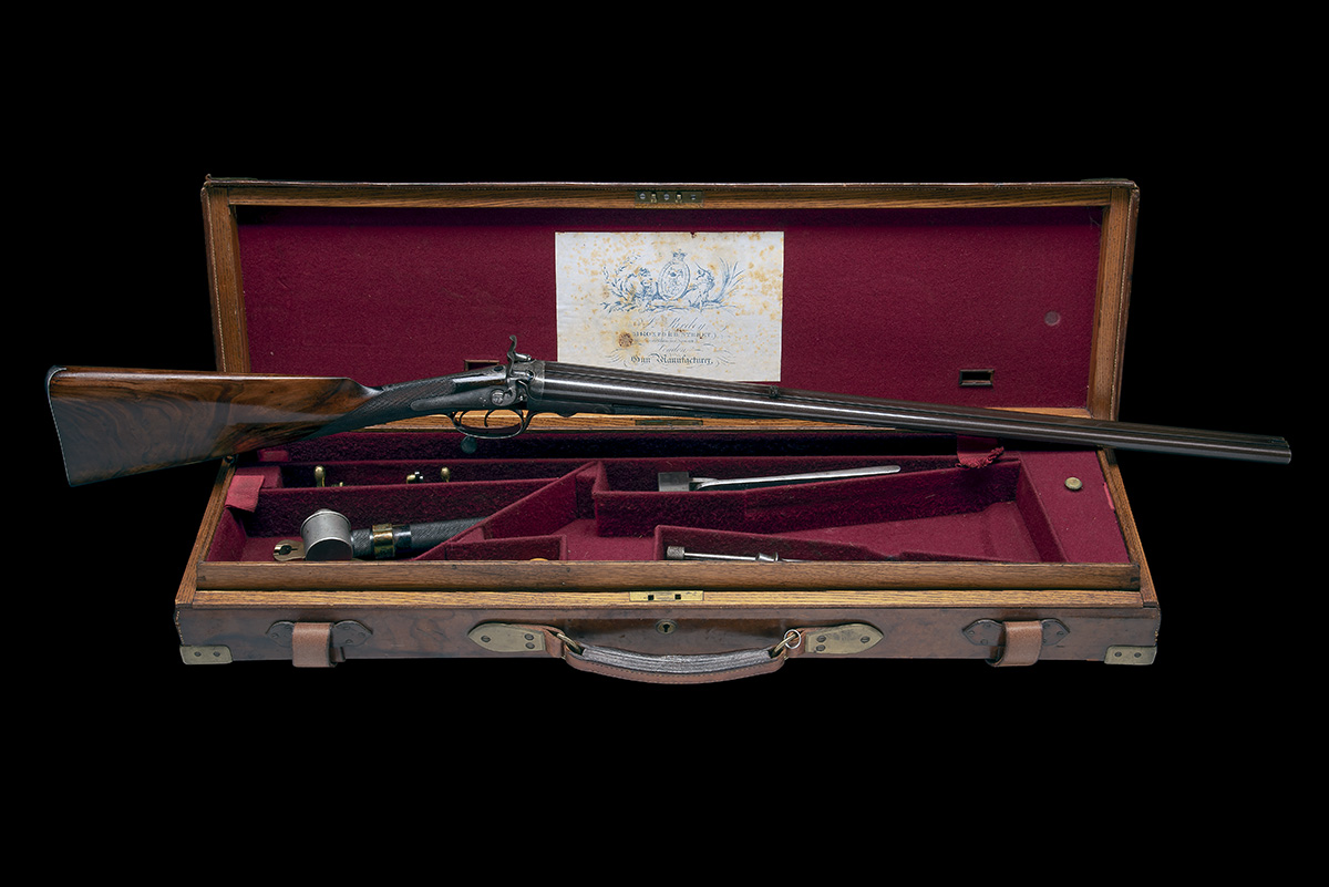 Provenance: The makers have kindly confirmed that the rifle was ordered in 1875 on behalf of H.R.H. The Prince of Wales to be given as a gift to the Nizam on his approaching tour of India. A similar .450 Black powder express double rifle, serial no. 8603 (originally built for Walter Winans in 1871 and subsequently returned as a part exchange in 1874) was reconditioned and recased, also as a gift for the Nizam (and is currently in the collection at the Royal Armouries). A number of other rifles were ordered at the same time, also destined to be gifts for various other Princely Heads of State. The ledgers record this rifle as 'C.F. double pea rifle, 100 bore, No. 9165, in case complete, engrave on the barrels H.H. The Nizam of the Deccan, etc, fine gold oval, engraving, 200 cartridges'