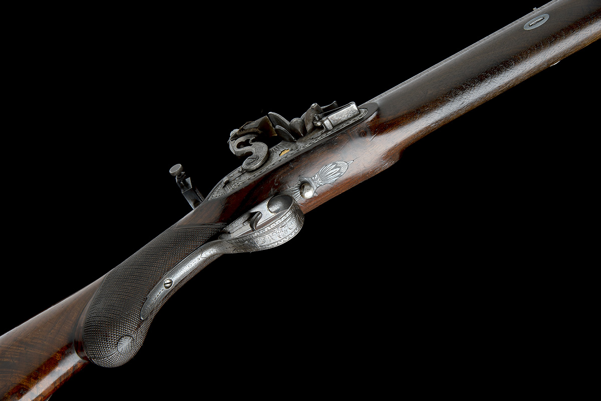 circa 1820, with twist steel octagonal 31 1/2in. barrel, the top-flat marked 'GUNMAKER TO H.R.H. THE PRINCE REGENT', dove-tailed fore-sight with later tunnel protector, standing notch rear-sight with additional folding leaf, the breech-block inlet with a gold poincon marked 'BAKER, LONDON' together with a fleur-de-lys, gold line to rear of breech, trophy engraved top-tang, socket mounted at wrist containing an adjustable peep-sight, border engraved bevel-edged lock signed in a gold poincon similar to the breech, pierced cock with sliding safe behind, rainproof pan, walnut half-stock with chequered semi pistol-grip butt, raised cheek-piece, long engraved iron patch-box, iron furniture and provision for under-barrel ramrod (missing), weight approximately 8 1/2lb., overall length 47in.