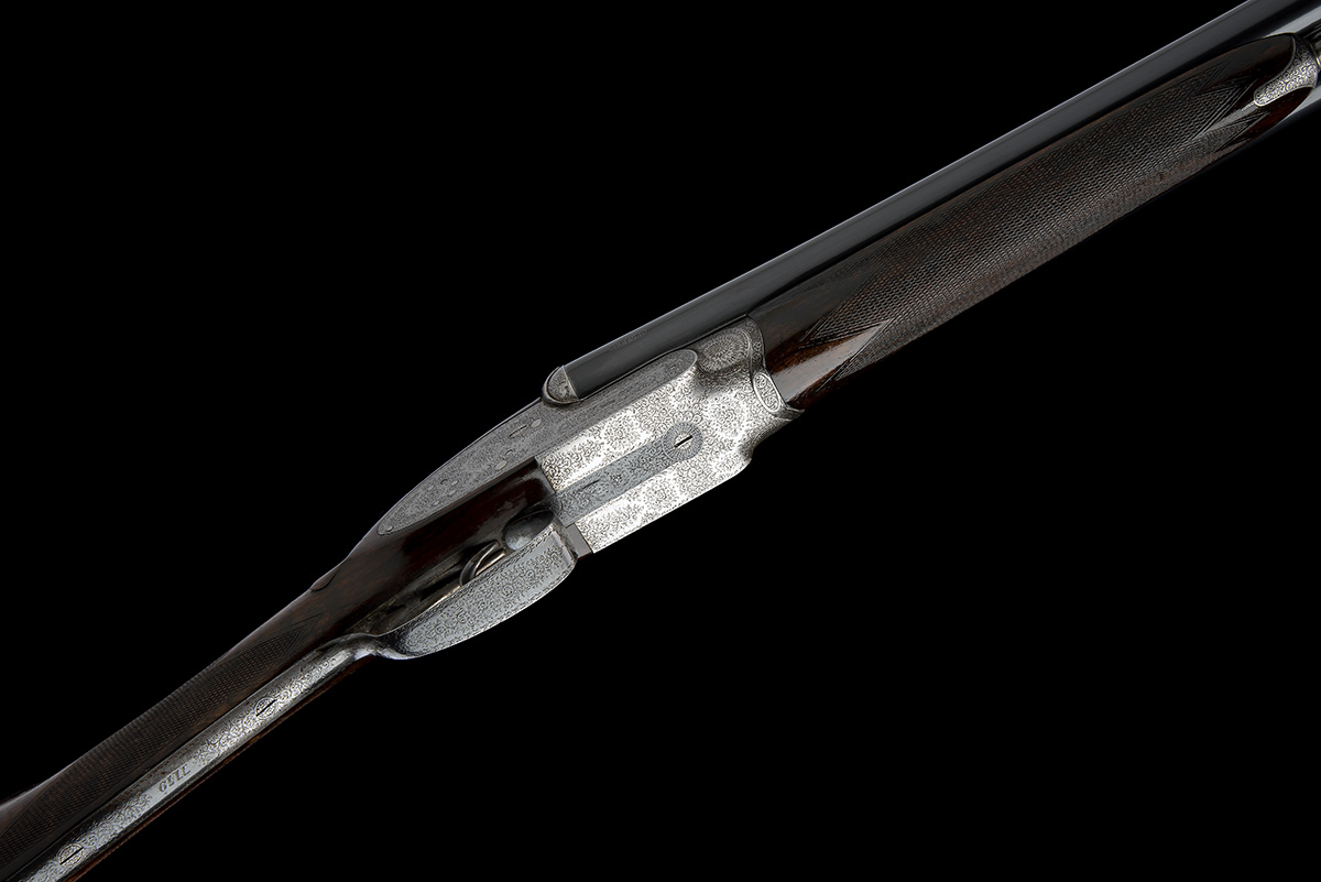 circa 1891, 26in. sleeved nitro barrels (in 1970), the rib engraved 'F. BEESLEY (FROM PURDEYS). 85. EDGWARE ROAD. LONDON.', 2 1/2in. chambers, bored approx. 1/4 and 3/4 choke, action incorporating Beesley patent no. 8657 of 1886, treble-grip action with arcaded fences, slender toplever, automatic safety with gold-inlaid 'SAFE' detail, bouquet and scroll engraving (some distortion to the triggerplate tang), 14 1/4in. figured stock including 1in. wooden extension, weight 5lb. 14oz., in its makers brass-cornered oak and leather case with red baize-lined interior fitted for 28in. barrels, lid interior with 'F. Beesley, Late on the Staff of James Purdey & Sons' trade label inked with the gun serial number and charge information