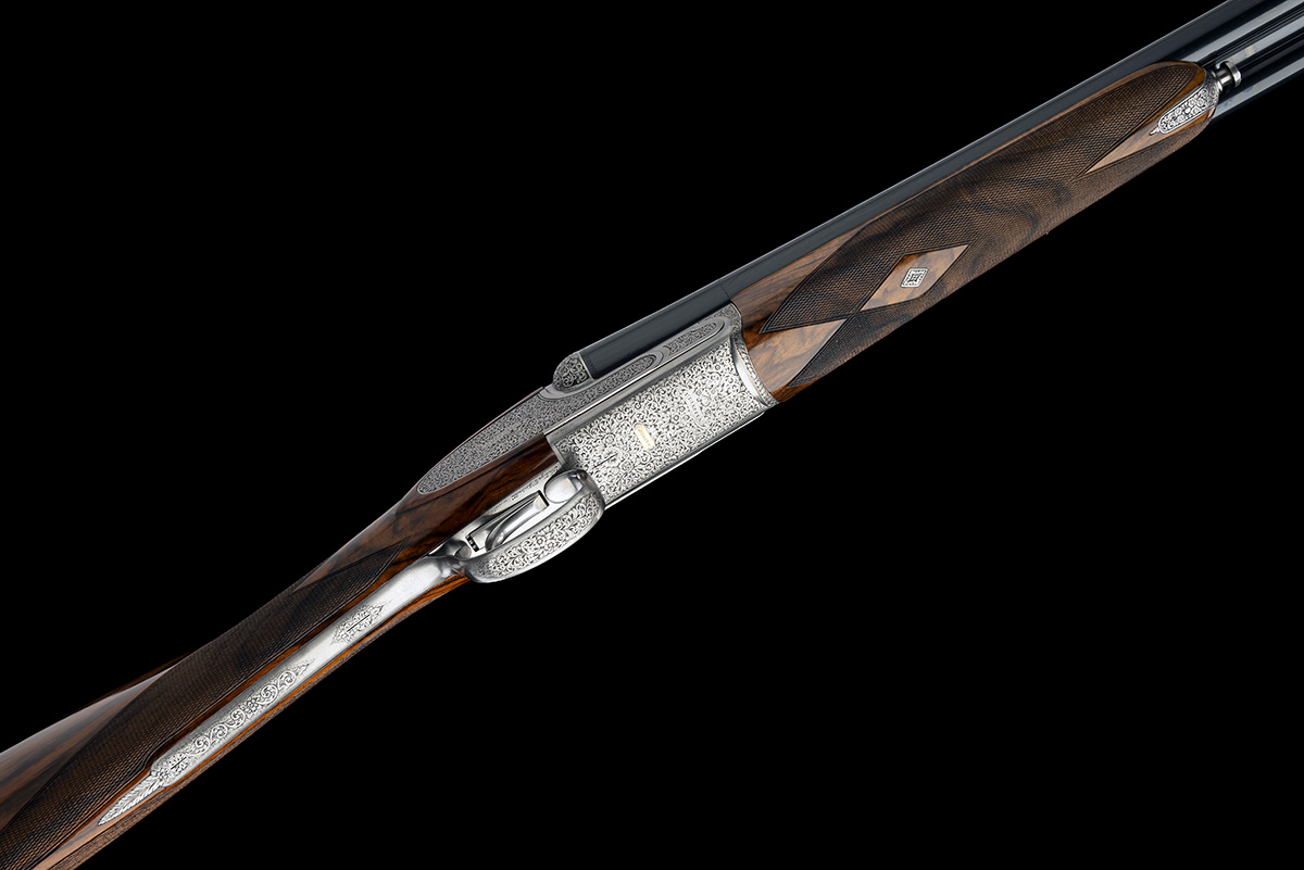 dated 2003, 28in. Excelsior high strength alloyed steel nitro monobloc barrels, 3in. chambers, bored approx. 1/4 and 1/2 choke, automatic safety with integral barrel selector switch, the action, fences and furniture engraved with floral scrollwork, the decorative sideplates engraved en suite, the underside inlaid 'GIUBILEO II' in gold, the triggerplate signed 'Bottega C. Giovanelli Inc. Bellini S', bright finish, the fore-end with ejector / non-ejector switch, 14 1/2in. figured stock including buttplate, weight 6lb. 9oz., in its makers case with some paperwork and a Stratton 'The Retainer' tie-pin, and with cardboard outer