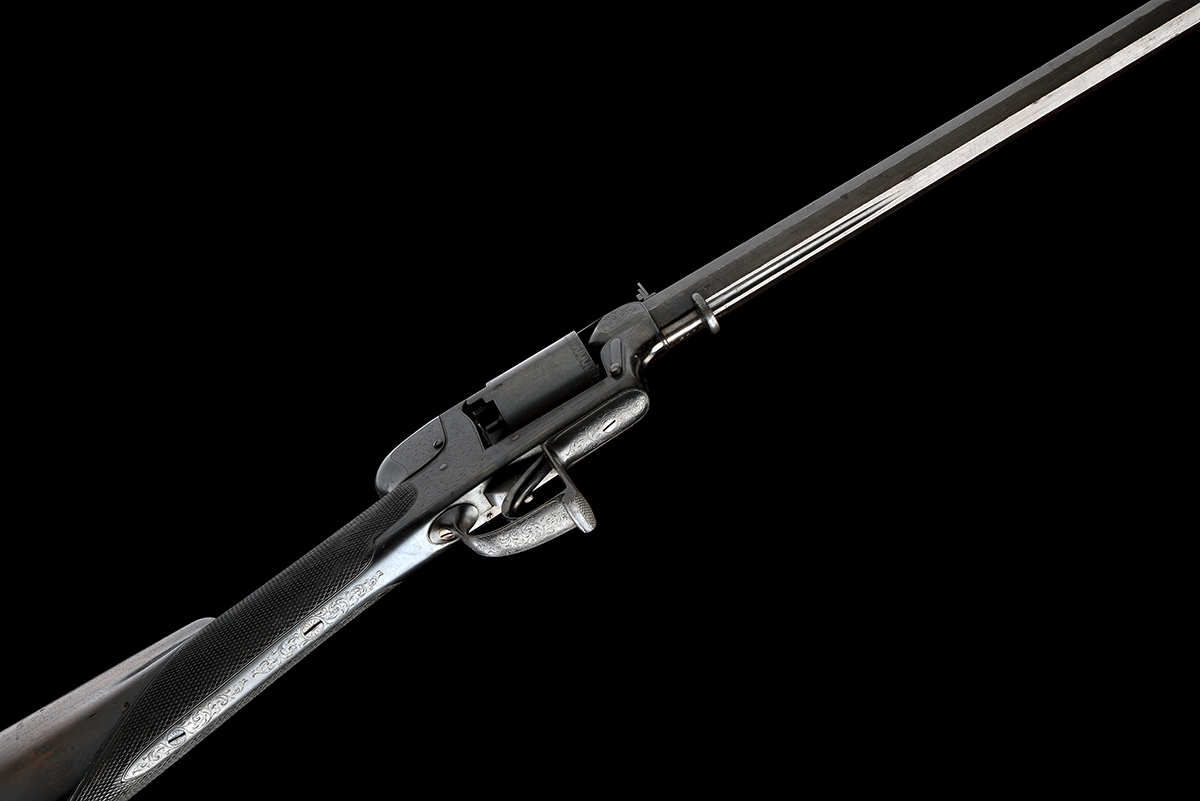 with 23in. London proofed octagonal barrel, dovetailed blade front-sight, and leaf rear-sight to 300 yards, the barrel stamped on the underside, '399 No 32', assembly number 399 and calibre 32-bore, the action top signed 'DEANE ADAMS & DEANE NO 30 KING WILLIAM ST. LONDON BRIDGE', the frame superbly foliate scroll engraved, hammer shroud fitted over the action also engraved to match, the trigger-guard with a flat front to provide grip beneath the frame keeping the shooter's hand away from the front of the cylinder, the trigger guard also engraved with foliate scroll-work for its entire length, five shot cylinder with engraved decoration to front edge and numbered '12,273R', iron mounted figured walnut butt with chequered wrist, iron butt-cap the long tang engraved with foliate decoration, the barrel and action reblued at sometime in the past. Adams revolving rifles are exceptionally rare