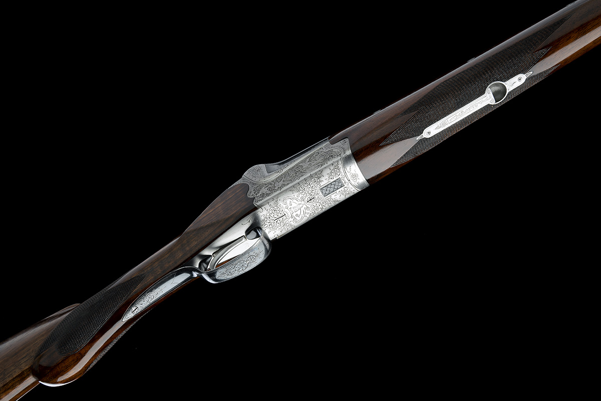 dated 1977, 28in. nitro barrels with 8mm solid matt top-rib, 2 3/4in. chambers, bored approx. imp. cyl. and 1/4 choke, three-piece fore-end with wooden side fillets, scroll-back bolstered action with hold-open toplever, automatic safety, acanthus scroll engraving surrounding carved game scenes, brushed finish, 14 1/2in. semi-pistolgrip stock including 1/4in. extension, weight 6lb. 14oz.