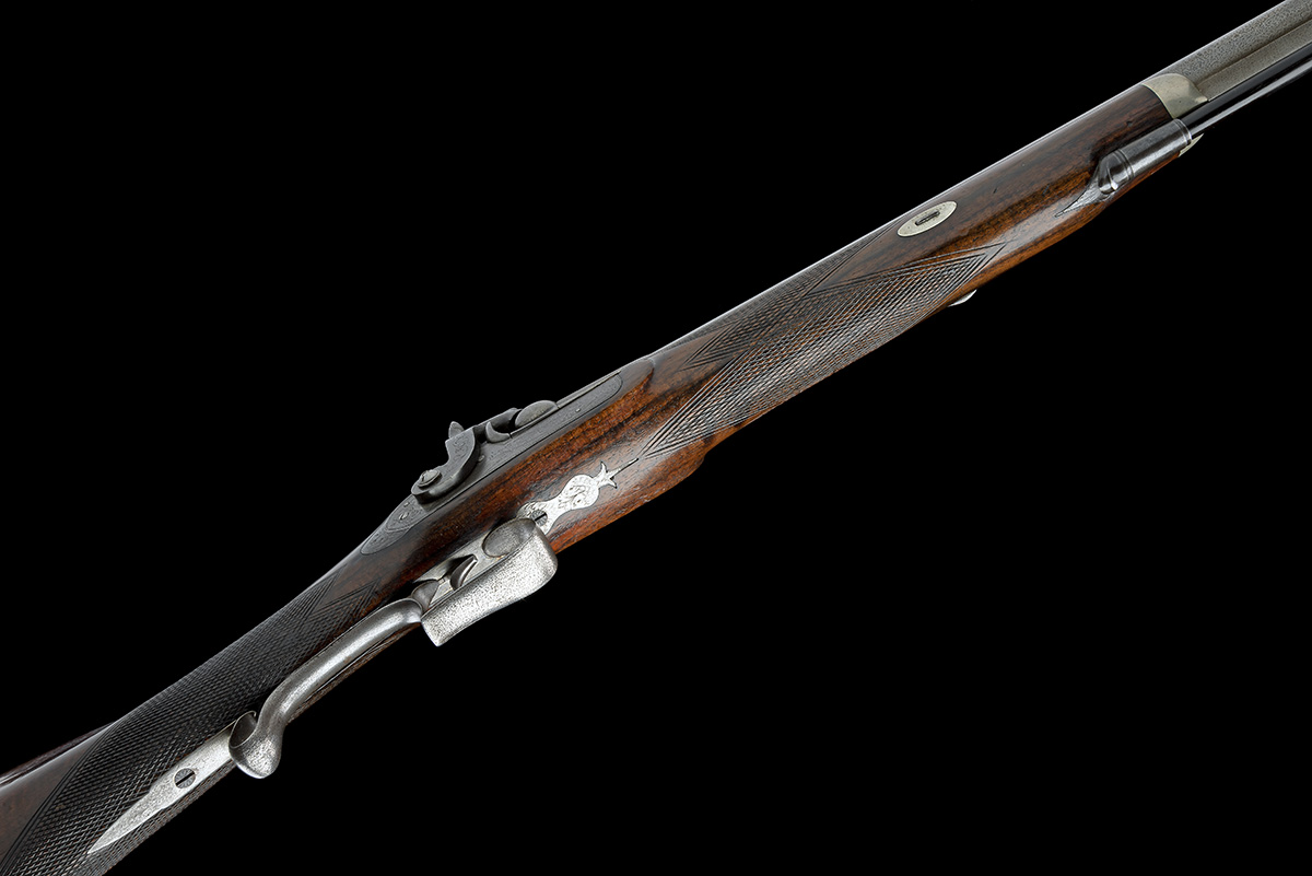 circa 1835, with round 33in. barrel re-proofed in 1985 (mild external pitting and lightly cleaned of finish), the top signed in gold script 'RICHD MANDER' together with an inlet gilt silhouette scene of hunters flushing game-birds with dogs, scroll engraved breech, scroll engraved top-tang, border, scroll and game-scene engraved flat bar-action lock, scroll engraved hammer, chequered walnut half-stock with white-metal oval escutcheon to the wrist, iron long-spur scroll engraved heel-plate, square-backed trigger-guard with scrolled pistol-grip tang, white-metal take-down barrel-key escutcheons and fore-end tip, under-barrel rib with two thimbles and period ramrod