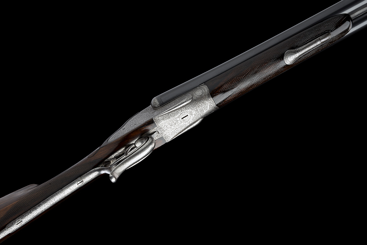 circa 1884, 28in. sleeved nitro barrels, broad rib engraved in gothic script 'JNO. RIGBY & CO. 72, ST. JAMES'S STREET. LONDON AND DUBLIN', (refreshed), 2 1/2in. chambers, bored approx. true cyl. and 1/4 choke, action incorporating J. Rigby and T. Bissell patent rising third bite, patent no. 1141 of 1879, use number 252, push-forward underlever, removable striker discs, automatic safety with gold-inlaid 'SAFE' detail, dipped-edge lockplates, carved leaf fences, profusely engraved with best border and bold scroll engraving (some wear and patination),15 1/4in. replacement stock, fore-end with Rigby patent screw-grip fore-end fastener, weight 6lb. 14oz.