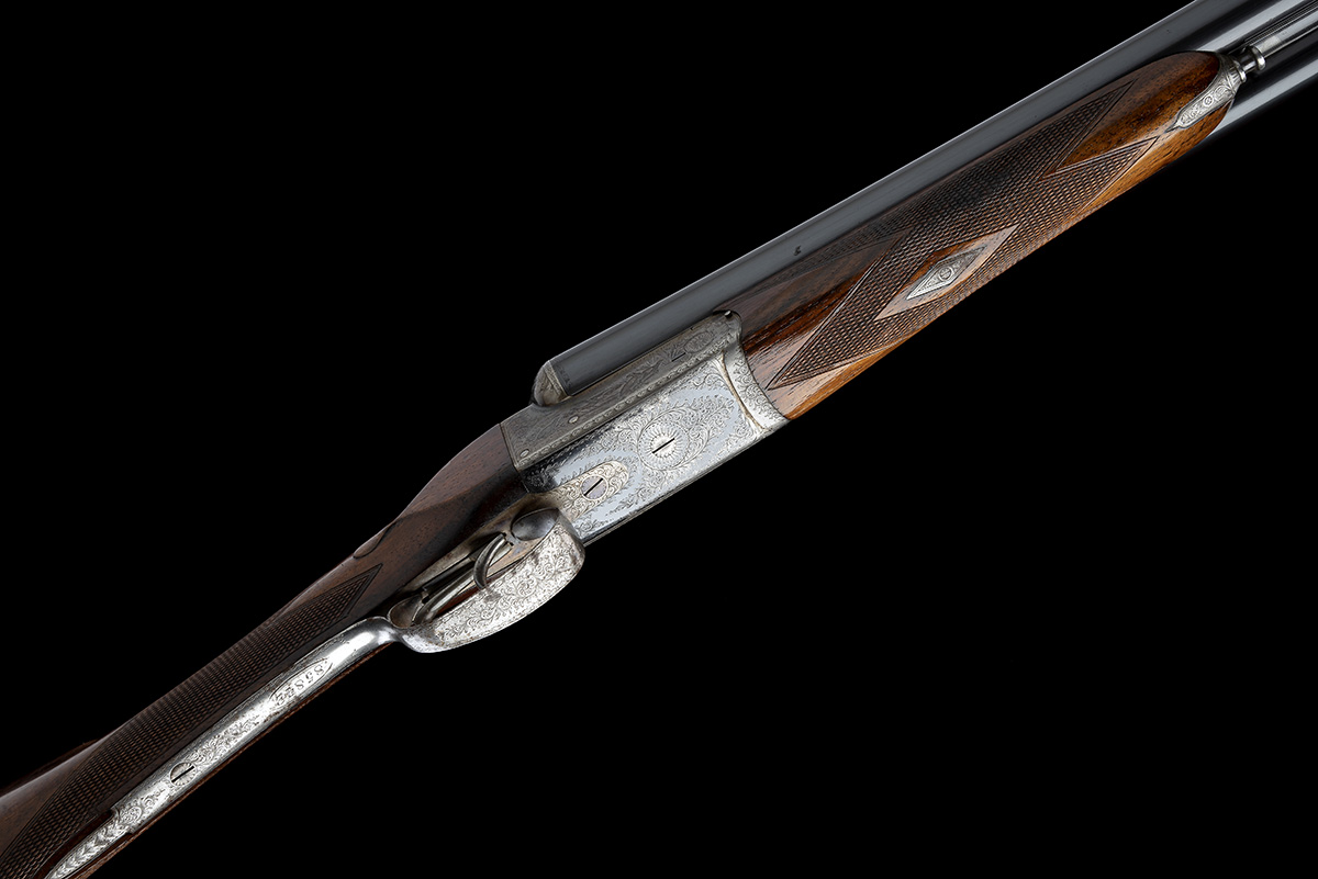 circa 1945, 26in. nitro barrels with Churchill-type rib, tubes engraved 'JOHN MACPHERSON. INVERNESS.', 2 1/2in. chambers, bored approx. imp. cyl. and 3/4 choke, treble-grip action, automatic safety with gold-inlaid 'SAFE' detail, border and partial scroll engraving surrounding vignettes of game, retaining traces of original colour-hardening and finish, 14 1/2in. stock (escutcheon removed) including 1in. rubber recoil pad, weight 6lb. 7oz.