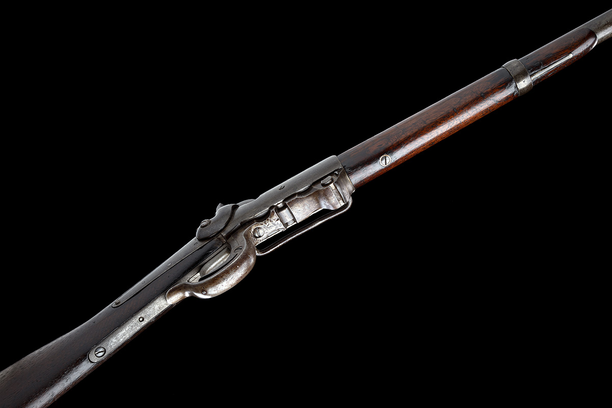 with 21in. barrel fitted with pinched blade front-sight, and leaf battle rear-sights to 500 yards, the breech top stamped 'BURNSIDE PATENT / MODEL OF 1864', (faint), interestingly although marked "Model of 1864" deliveries started in 1863 and this is one of the early deliveries from that year, breech block and action stamped with the serial number 6954, and for the convenience of the trooper a side-rib is fitted to the left-side of the action, back-action lock stamped in small letters 'BURNSIDE RIFLE CO. / PROVIDENCE R.I.', (faint), two piece iron mounted walnut stock, the splinter fore-end with one spring retained band, the butt with crescent butt-plate