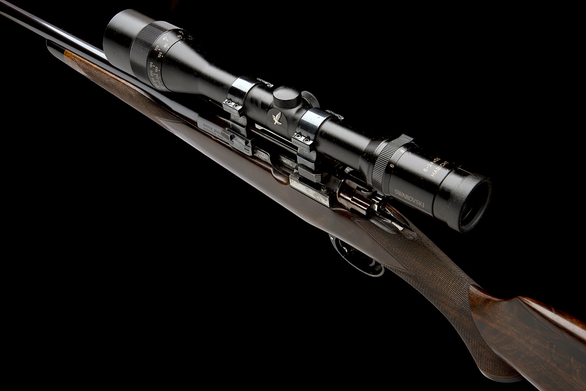 for 1997, 22 3/4in. unsighted nitro barrel engraved 'RONALD WHARTON (FROM RIGBY'S), RUSPER, WEST SUSSEX, ENGLAND', the receiver (with thumb cutout) side-mounted with a Swarovski 6-24x50 Habicht telescopic sight, serial no. P711103849, in quickly-detachable mounts, the receiver ring engraved 'MAUSER MODELO ARGENTINO 1909', the side wall with the Mauser Waffenfabrik Berlin markings (partially obscured by the side mount), hinged floorplate with push button release, captive take-down screw, the triggerguard engraved with a scrolling banner with the serial number, well-figured pistolgrip stock with right side cheekpiece and comb raising insert, horn pistolgrip-cap and finial, sling eyes,13 3/8in. pull, weight 7lb. 3oz. (unscoped) and 9lb. 5oz. (with scope); together with a highly-figured stock blank selected to be a replacement stock for this rifle