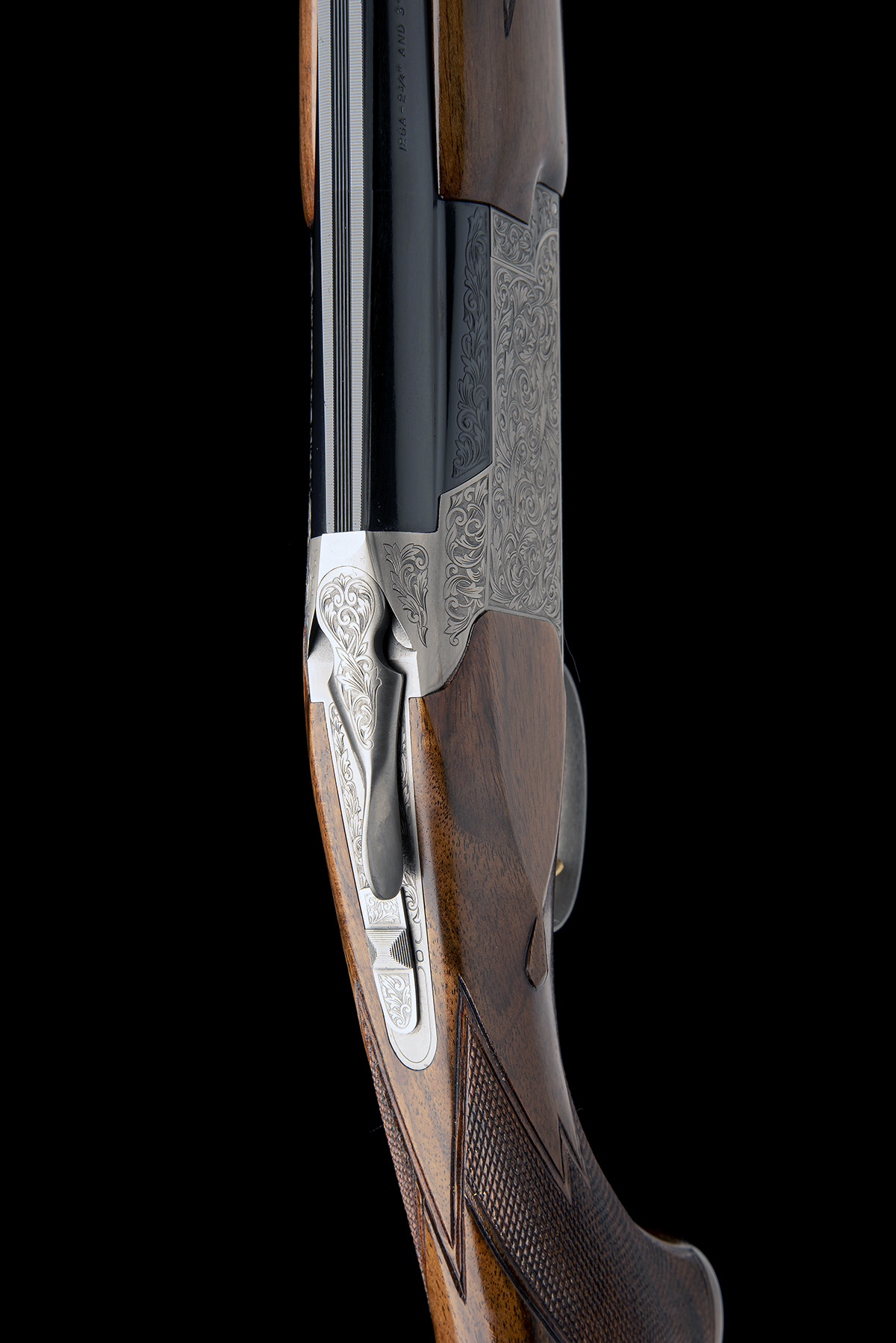 for 2013, 30in. nitro reproved barrels (in 2014) with 10mm ventilated matt top-rib and ventilated mid-rib, 3in. chambers, multichokes (with spares), hold-open toplever, manual safety with integral barrel selector switch, adjustable gold-washed trigger, fully engraved with bold acanthus scrollwork on a matted background, matt silver finish, 14 3/8in. figured pistolgrip stock with palm swell and including 3/8in. rubber recoil pad, weight 7lb. 12oz., in its universal case