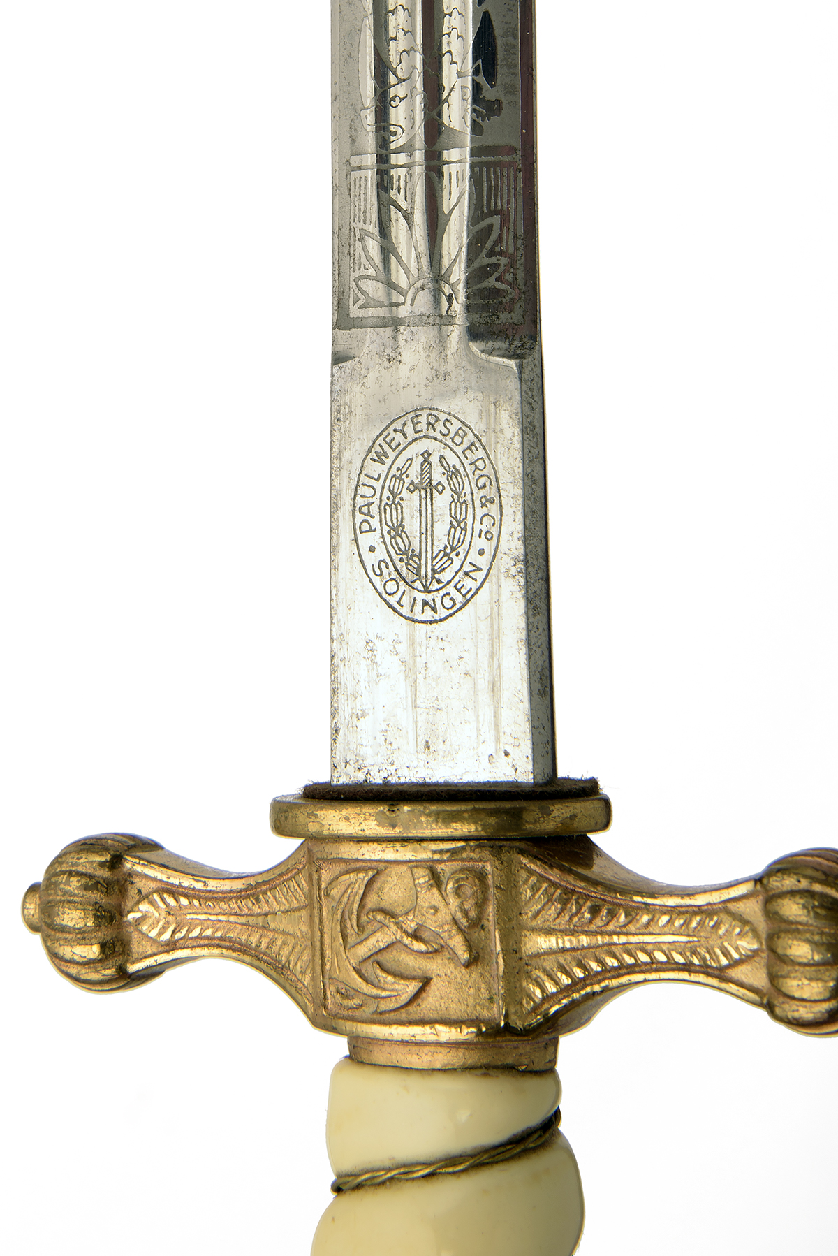 circa 1937, with 10in. stiletto blade etched with floral devices, arabesques and fouled anchors, twin narrow blind fullers to both sides, squared ricasso with maker's mark at forte, carved and gilded cross-guard with central anchor devices and a push-button scabbard lock, wire-bound cream-coloured celluloid grip and eagle and swastika pommel, complete with its brass scabbard embossed with lightning bolts and fitted with twin loose suspension rings