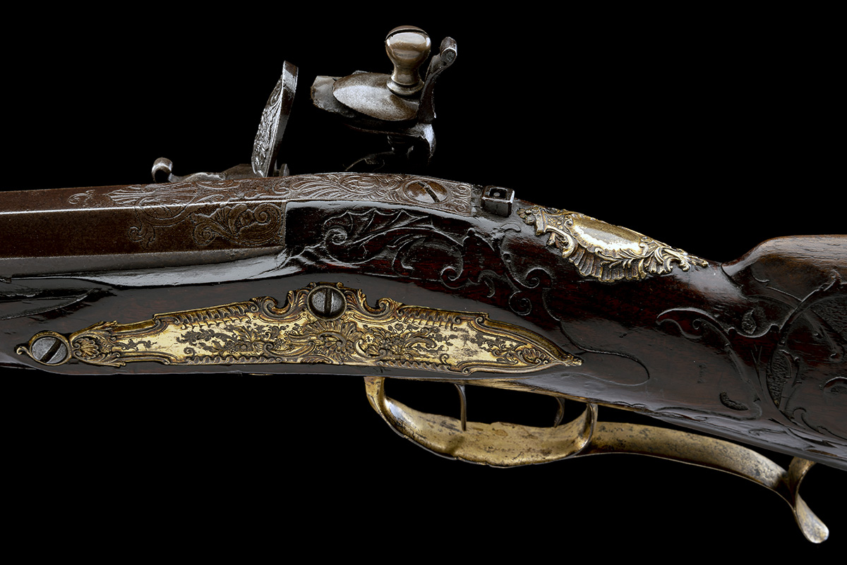 circa 1760, with swamped octagonal 27in. barrel, dove-tailed brass fore-sight surrounded by engraved scrolls on a stippled ground, standing notch rear-sight with additional folding leaf and carved and engraved foot, the breech-end with similar engraved scrolls to the muzzle, square socket for peep-sight to top-tang (sight absent), flat bevel-edged lock with pointed tail and signed behind the frizzen spring 'PERNSDORFFER, ANSBACH', the lockplate relief carved and engraved with a scene of dogs hunting a stag, relief scroll engraved cock, relief moulded face to the frizzen, walnut full-stock with raised cheek-piece and relief carved with running vines to wrist, heel and fore-end, carved borders to the ramrod channel, rococco scroll relief moulded gilt brass sliding patchbox cover, heel-plate, trigger-guard bow, sideplate, nose-cap and ramrod pipes (some wear to gilding), double set triggers and fitted with swivels for sling