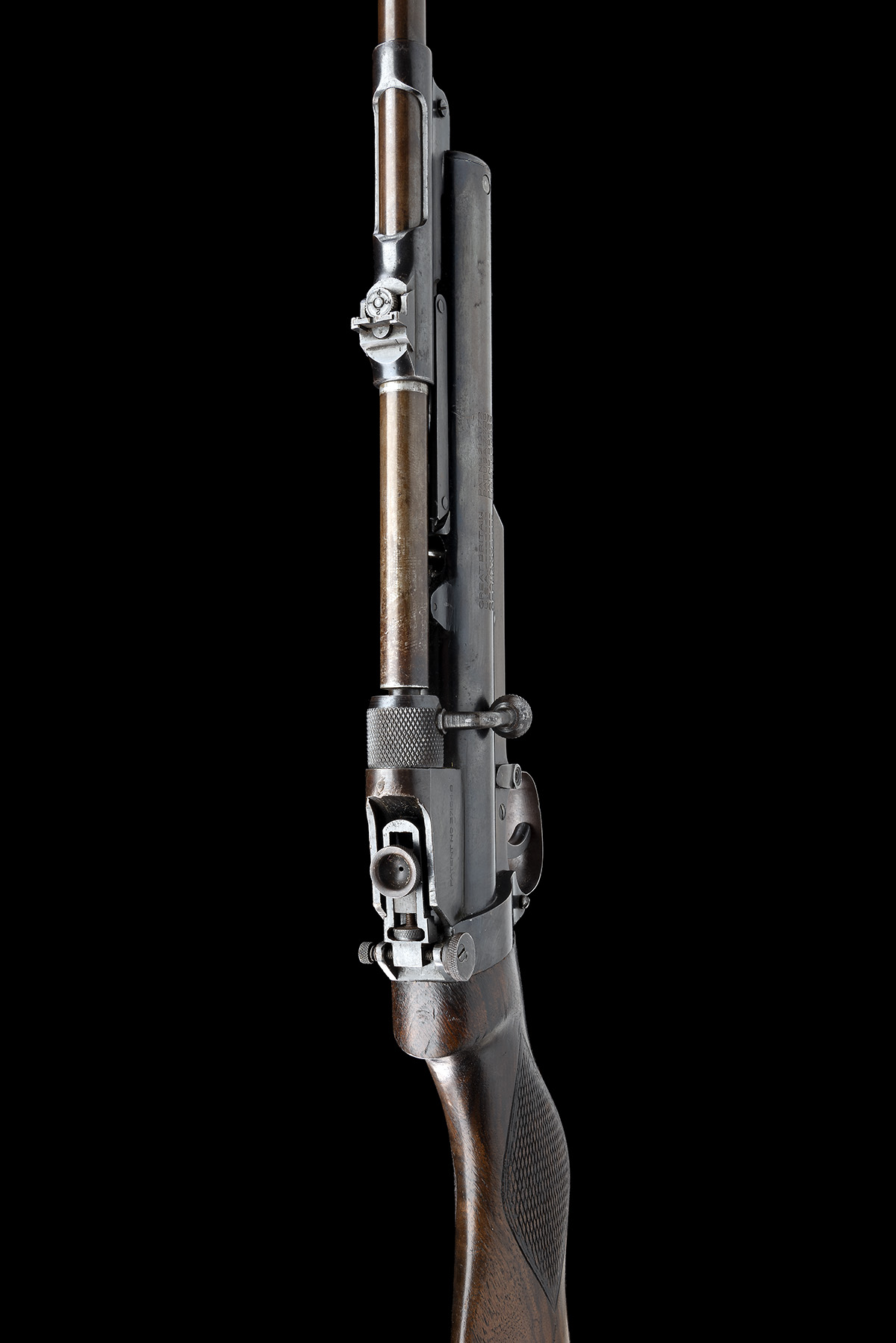 circa 1934, with matching number 25 1/2in. barrel fitted with a ramp and blade fore-sight, push-button barrel release, elevating dove-tailed rear-sight to the barrel cradle, rotating bolt-handled barrel-lock, second style peep-sight to rear, blued air-chamber with model details and patents, anti bear-trap device, trigger unit with makers name and address, swinging safety catch, walnut semi pistol-grip butt-stock, ribbed horn heel-plate, the whole retaining a strong amount of original blued finish
