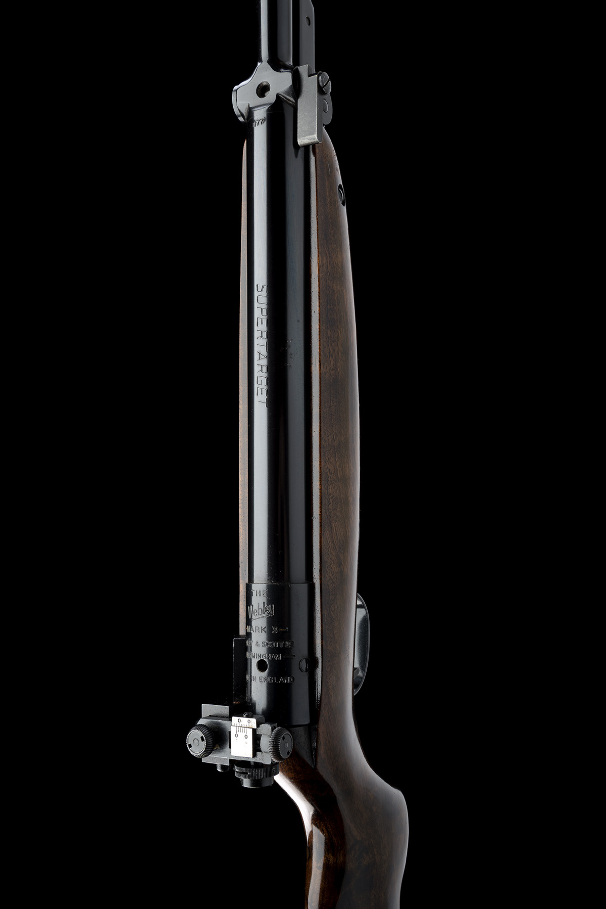 for 1st December 1973, with blued 18 1/2in. barrel, ramp and alloy tunnel fore-sight signed 'PARKER-HALE', no provision for rear-sight on barrel, squared loading tap handle at breech, plain blued air-chamber marked 'SUPERTARGET', trigger-housing stamped with make and model and factory fitted with a 'PARKER-HALE' side-mounted aperture sight model 'PH17B', walnut half-stock with inset 'WEBLEY' white plastic medallion and sight element holder to heel of pistol-grip, blued push-button under-lever, the whole appearing very little used throughout