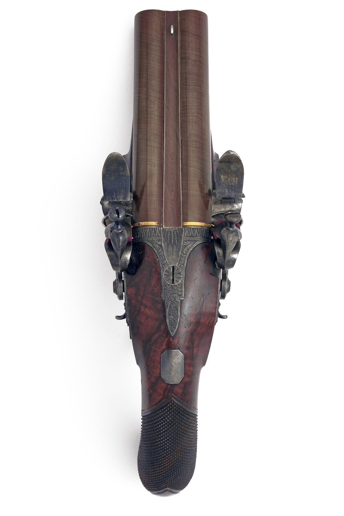 circa 1810, with expertly rebrowned 4 3/8in. side by side barrels, the top-rib signed 'WILSON, LONDON', small applied crescent fore-sight, gold bands at breech, platinum lined touch-holes, fully engraved top-tang with shallow sighting groove, border engraved bevel-edged locks signed 'WILSON' below the semi rainproof pans, sliding safes behind the engraved swan-necked cocks and rollers to the frizzen-springs, walnut three-quarter stock with chequered bag-shaped butt, engraved and blued trigger guard bow and horn-tipped ramrod, strong amount of original finish to iron furniture