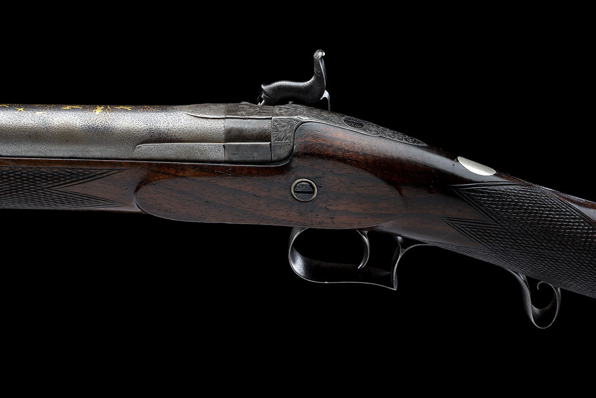 circa 1835, with round 33in. barrel re-proofed in 1985 (mild external pitting and lightly cleaned of finish), the top signed in gold script 'RICHD MANDER' together with an inlet gilt silhouette scene of hunters flushing game-birds with dogs, scroll engraved breech, scroll engraved top-tang, border, scroll and game-scene engraved flat bar-action lock, scroll engraved hammer, chequered walnut half-stock with white-metal oval escutcheon to the wrist, iron long-spur scroll engraved heel-plate, square-backed trigger-guard with scrolled pistol-grip tang, white-metal take-down barrel-key escutcheons and fore-end tip, under-barrel rib with two thimbles and period ramrod