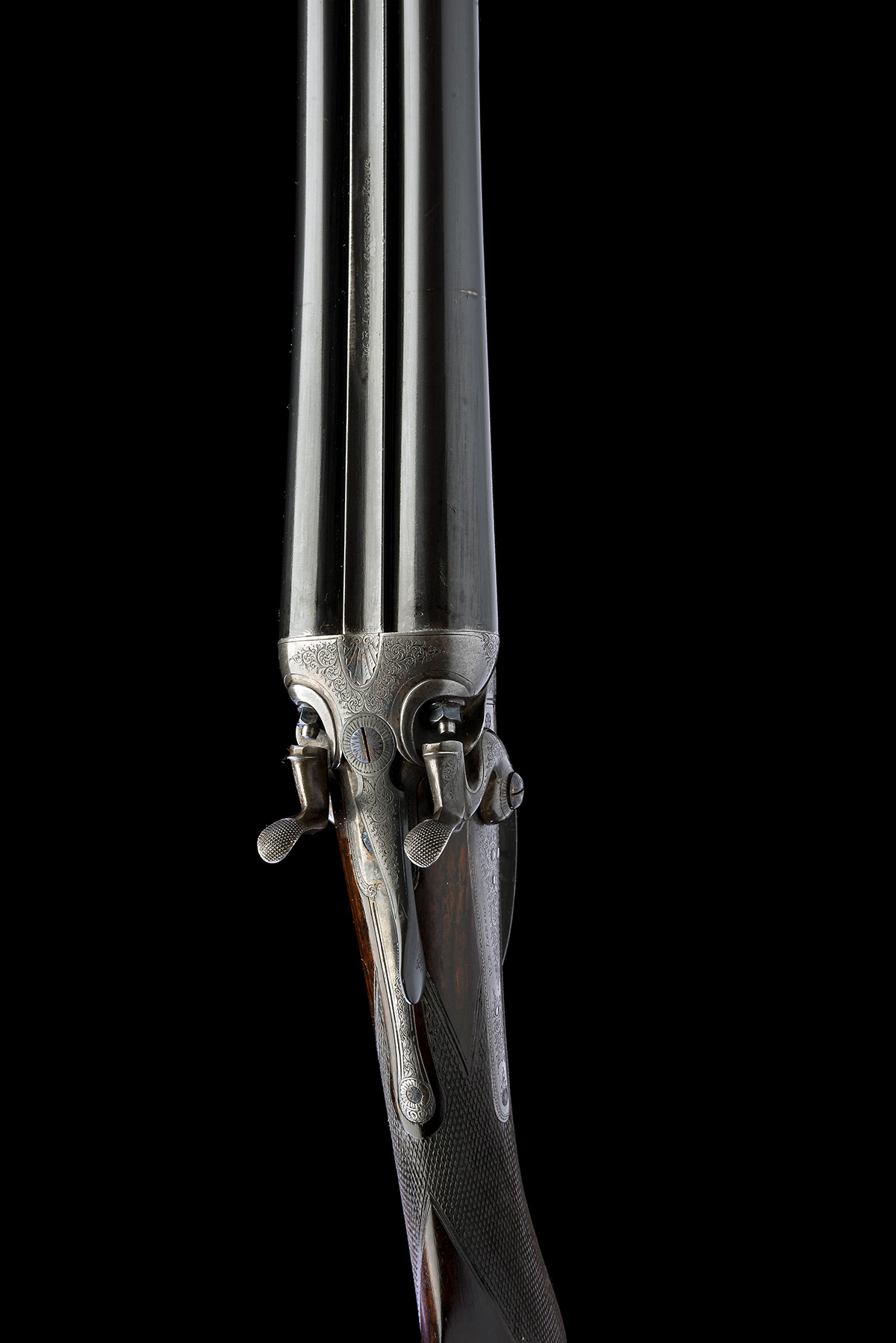circa 1890, 28in. sleeved steel to damascus barrels, rib engraved 'W.R. LEESON. ASHFORD. KENT.', 2 1/2in. chambers, bored approx. imp. cyl. and 3/4 choke, carved percussion fences, rebounding locks, beaded border and partial acanthus scroll engraving, retaining traces of original colour-hardening and finish, 14 1/2in. figured semi-pistolgrip stock with steel heel and toe plates, weight 5lb. 15oz.