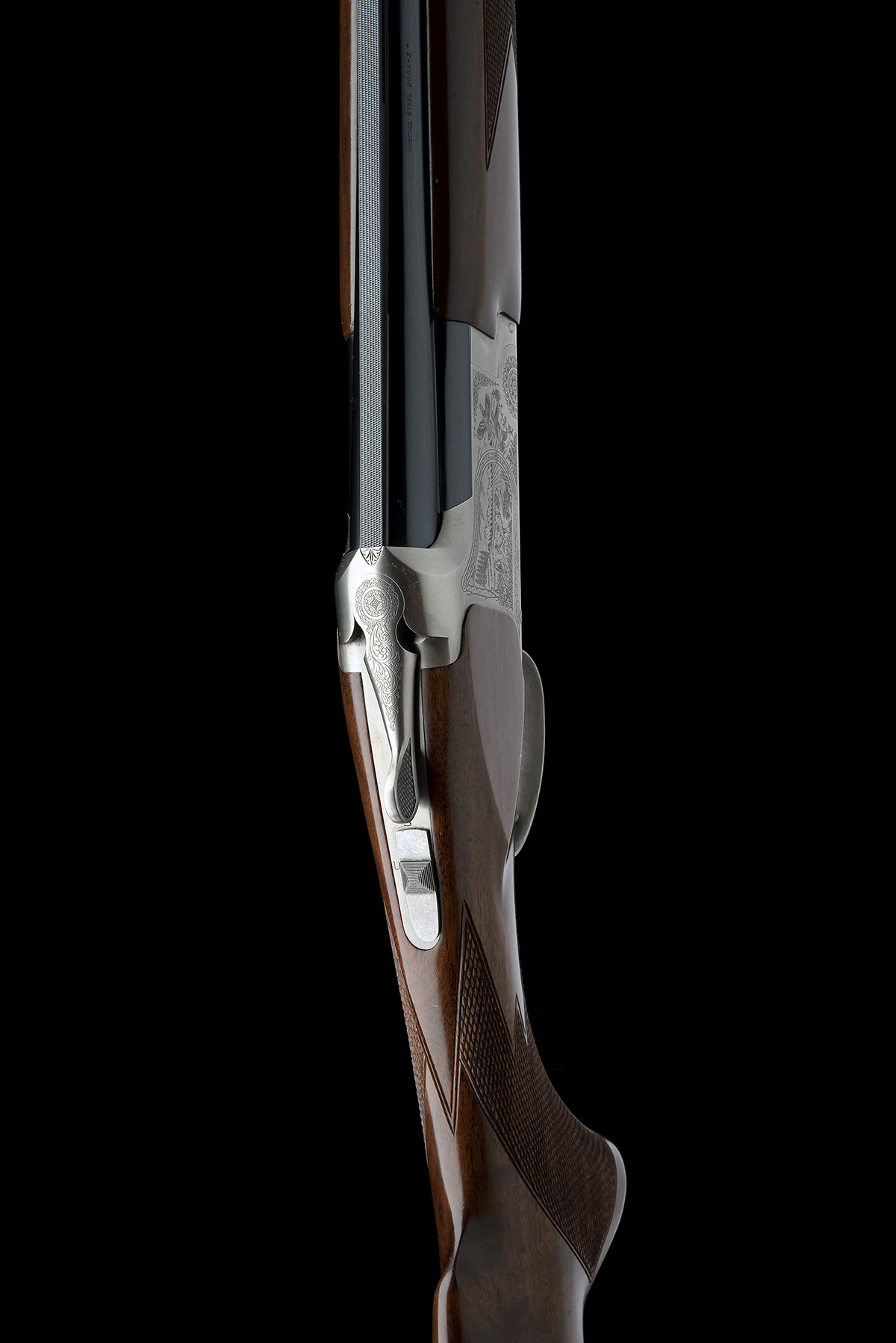 for 2000, 30in. nitro reproved barrels with 6mm ventilated matt top-rib, 3in. chambers, bored approx. 1/4 and 1/2 choke, hold-open toplever, automatic safety with integral barrel selector switch, floral and scroll engraving, the sides with game scenes of pointer and duck in a wetland setting to the left and pointer and partridge to the right, satin finish, 14in. pistolgrip stock including trademarked buttplate, weight 6lb. 7oz.