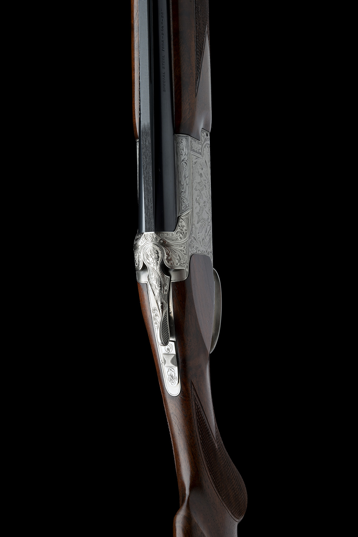 for 1989, 28in. nitro reproved barrels with 6mm ventilated matt top-rib, 2 3/4in. chambers, multichokes (no spares), hold-open toplever, manual safety with integral barrel selector switch, gold-washed trigger, bold acanthus scroll engraving with game scenes of duck and pheasant, bright finish, 14 3/8in. semi-pistolgrip stock including 1in. rubber recoil pad, weight 6lb. 12oz.