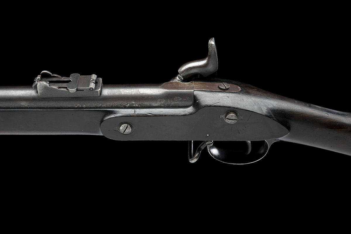 Provenance: This is a superior quality rifle by a top London maker with some unusual features such as iron mounts, standard P53 Enfield rifles were brass mounted and the four groove Nuthall's patent rifling