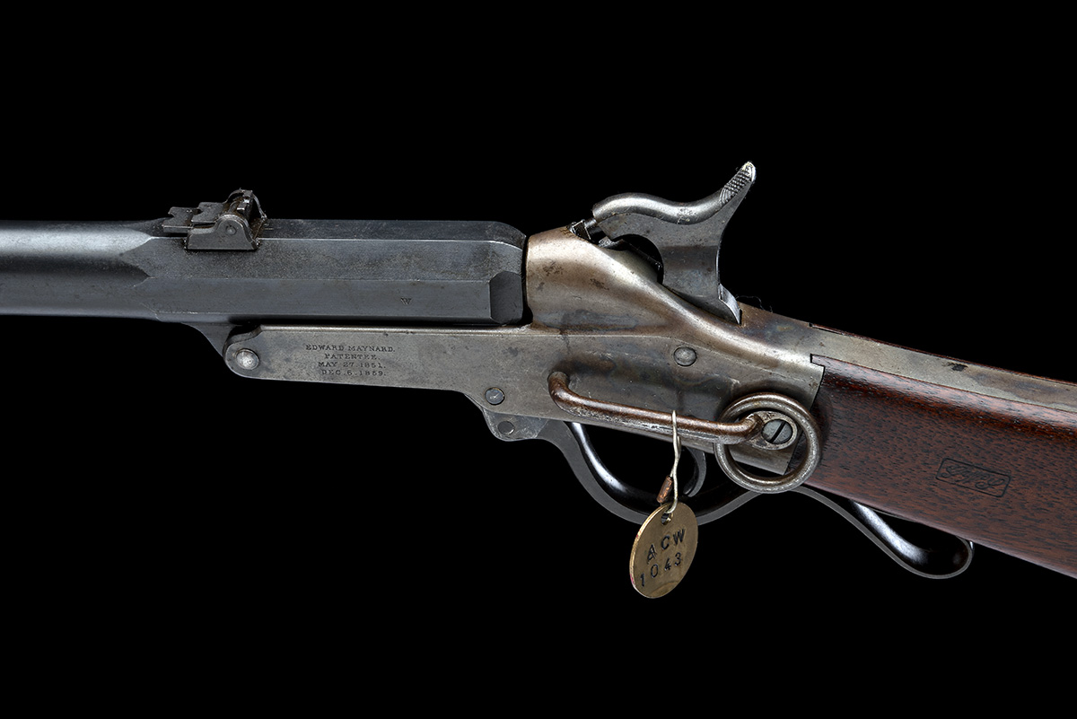 with 20in. round to octagonal barrel fitted with dovetailed pinched blade front-sight and three leaf battle rear-sights, frame stamped on the right 'MANUFACTURED BY / MASS. ARMS CO. / CHICOPEE FALLS' and on the left 'EDWARD MAYNARD / PATENTED / MAY 27 1851 / DEC 6 1859', fitted with a side-rib and ring, iron mounted walnut butt stock stamped with two inspecting officer's cartouches on the left, a superb example with most blue to barrel, case colours to action, fine untouched stock, museum quality, probably never issued