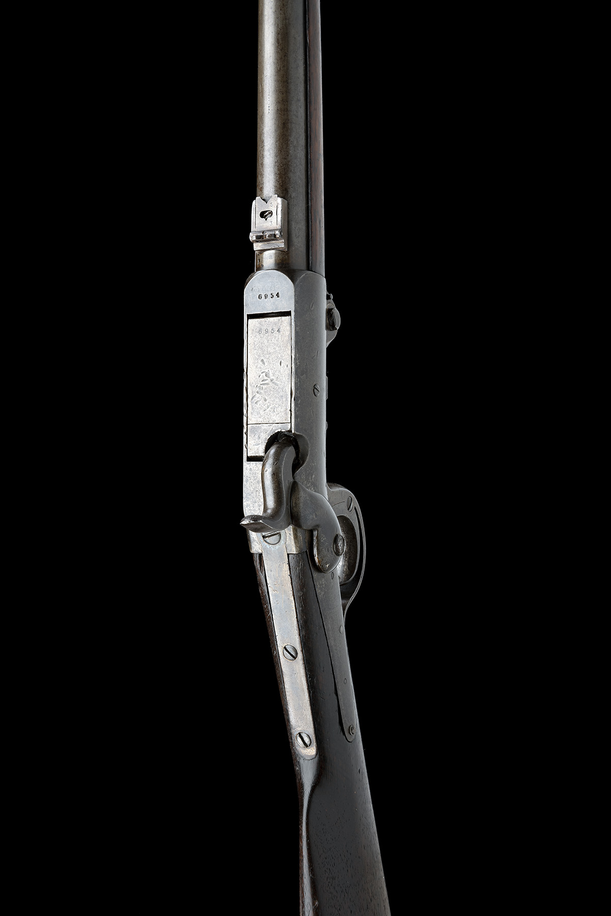 with 21in. barrel fitted with pinched blade front-sight, and leaf battle rear-sights to 500 yards, the breech top stamped 'BURNSIDE PATENT / MODEL OF 1864', (faint), interestingly although marked "Model of 1864" deliveries started in 1863 and this is one of the early deliveries from that year, breech block and action stamped with the serial number 6954, and for the convenience of the trooper a side-rib is fitted to the left-side of the action, back-action lock stamped in small letters 'BURNSIDE RIFLE CO. / PROVIDENCE R.I.', (faint), two piece iron mounted walnut stock, the splinter fore-end with one spring retained band, the butt with crescent butt-plate