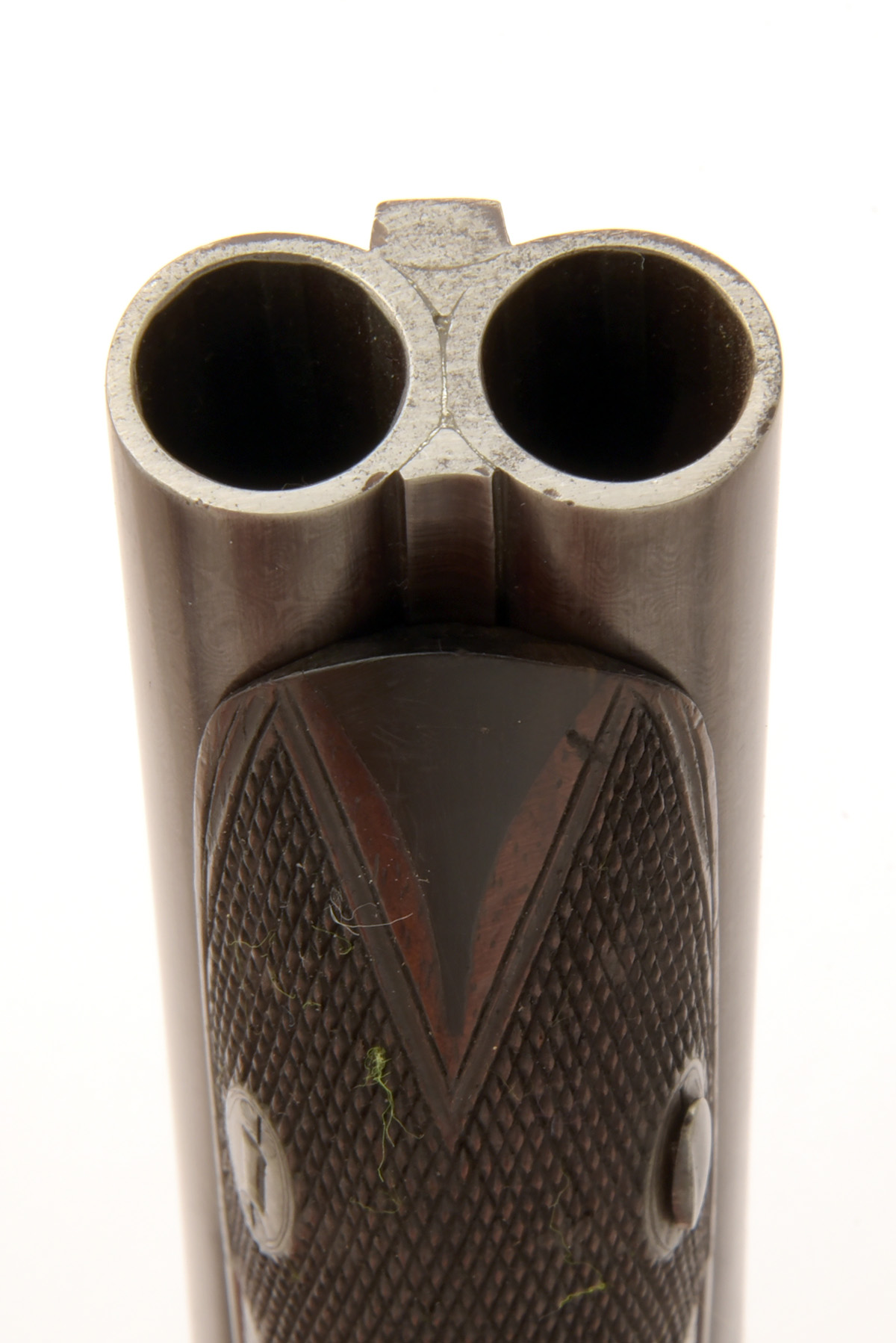 circa 1870, with browned damascus 6 5/16in. barrels, matted top-rib with rectangular panel signed ' THO'S HORSLEY, YORK', border engraved breech-end and pin apertures, engraved colour hardened rounded action body with 'Jones' type swing under-lever, shallow percussion fences, border and scroll engraved curved back-action locks signed 'THO'S HORSLEY', scroll engraved hammers, long engraved top-tang, chequered walnut grip, moulded and engraved iron butt-cap with central trap-door and chequered walnut splinter fore-end, strong traces of original colour and a good amount of finish remaining