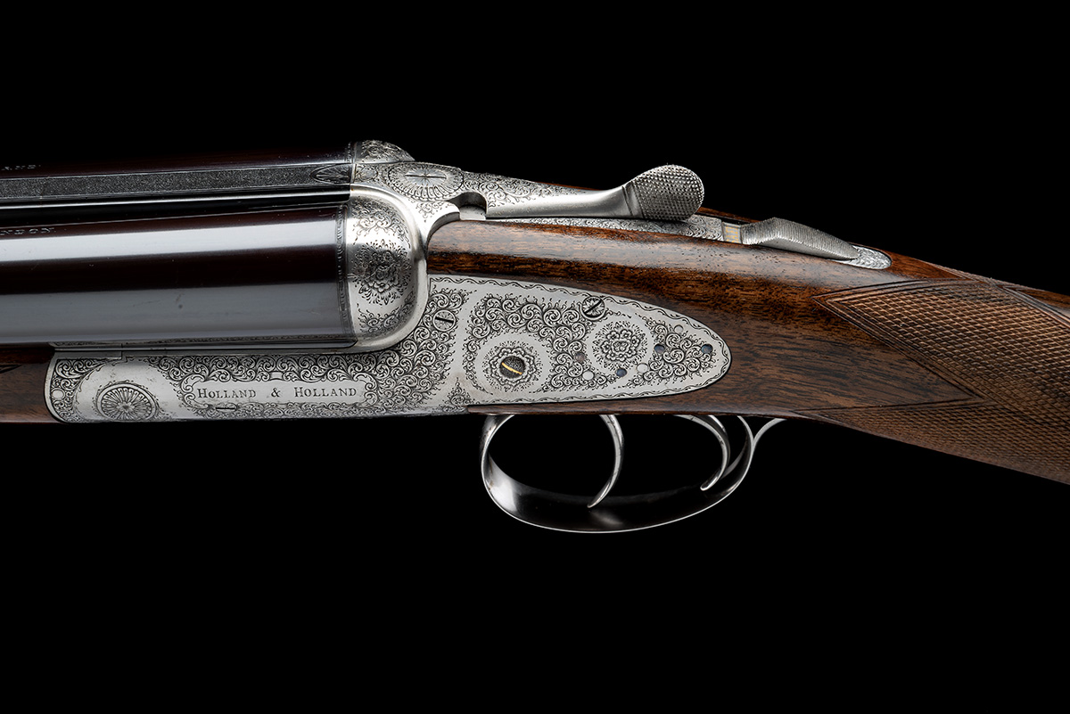 for 2008, 28in. nitro reproved chopperlump barrels (in 2023), finely matted sight rib with two folding leaf sights, marked for 50 and 100 yards and with gold-inlaid sightlines, bead fore-sight, the tubes engraved 'HOLLAND & HOLLAND. BRUTON STREET. LONDON', 2 3/4in. chambers, Colonel George Vincent Fosbery VC patent rifled chokes, patent no. 7564 of 1885, integrally bolstered rounded bar action, automatic safety with gold-inlaid 'SAFE' detail, gold-inlaid cocking-indicators, triggers set for the left hand, best fine acanthus scroll engraving with floral bouquets, the triggerguard gold-inlaid in drop shadow form with the serial number, 15 1/8in. well-figured stock cast on for the left shoulder, weight 7lb. 14oz.