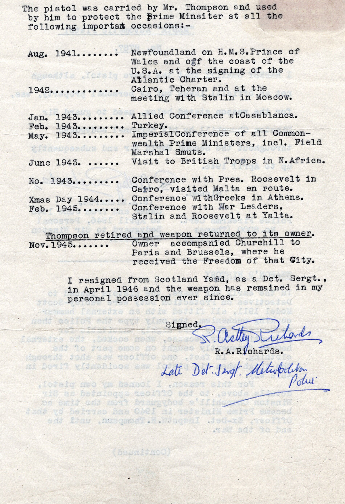 Provenance: This pistol comes with an archive of papers including a statement from a Mr R.A. Richards that this pistol was his own property and was lent to Detective Inspector W.H. Thompson, (who was then Winston Churchill's bodyguard) for the years 1940-1945. Mr Richards also acted as Churchill's bodyguard from June 1945 to April 1946, also apparently equipped with this pistol.
