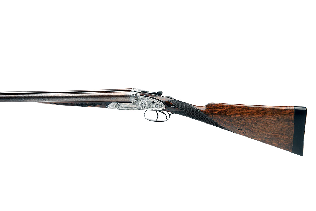 JOSEPH LANG & SON 12-BORE SIDELOCK EJECTOR, serial no. 7900, for 1895, 28in. nitro reproved fine damascus barrels (shortened), the rib engraved 'JOSEPH LANG & SON. 10. PALL MALL. LONDON.', 2 1/2in. chambers, bored approx. true cyl. in both, some pits, stylised carved leaf fences, removable striker discs, automatic safety with gold-inlaid 'SAFE' detail, fine acanthus scroll engraving with floral bouquets and ornate bordering, brushed bright and reblued finish overall, 14 3/8in. figured stock (cracks at the head to rear of lockplates) including 1in. ebonite extension, weight 6lb. 7oz.