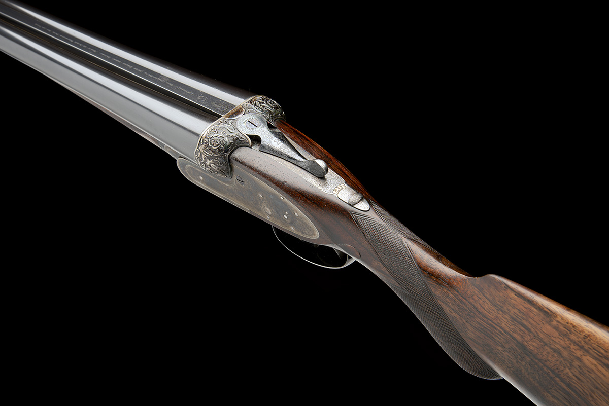 for 1894, 32in. nitro reproved Whitworth-steel chopperlump barrels with broad tapered rib engraved 'J. PURDEY & SONS. AUDLEY HOUSE. SOUTH AUDLEY STREET. LONDON. MADE OF SIR JOSEPH WHITWORTH'S FLUID-PRESSED STEEL', the breech end engraved '2' and with acanthus scroll detailing, 3in. chambers, bored approx. 3/4 and 1/2 choke, large treble-grip action with hidden third bite and side-clips, removable striker discs, toplever engraved '2', automatic safety with gold-inlaid 'SAFE' detail, arrow cocking-indicators, the fences carved in high relief with stylised floral motifs on a matted background, best fine acanthus scroll engraving with floral bouquets, retaining much original colour-hardening and finish, 14 3/4in. well-figured semi-pistolgrip stock (with well executed likely contemporary conversion to pistolgrip), weight 8lb., in its brass-cornered oak and leather guncase.