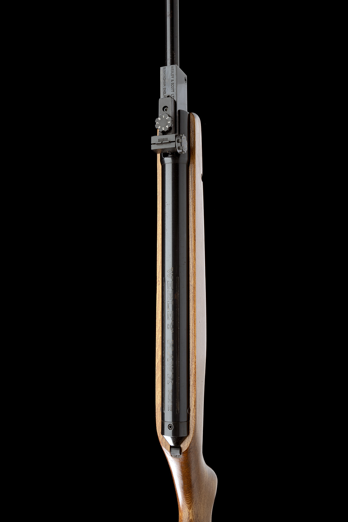 for 1974, with two blued 17in. barrels, one of each calibre and both fitted with ramp and tunnel fore-sights, adjustable rear-sight, blued air-chamber railed for a telescopic sight, transitional angular pattern beech half-stock blending the MKI butt with the MKII rounded fore-end, rubber crescent heel-plate, the whole in collector's external condition and complete in its card and polystyrene makers carton with a period 'WEBLEY' 4x15 telescopic sight, a packet of period Webley .177 sample pellets, original instructions and guarantee papers (card box distressed and stained)