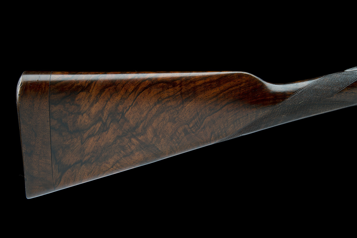 circa 1891, 26in. sleeved nitro barrels (in 1970), the rib engraved 'F. BEESLEY (FROM PURDEYS). 85. EDGWARE ROAD. LONDON.', 2 1/2in. chambers, bored approx. 1/4 and 3/4 choke, action incorporating Beesley patent no. 8657 of 1886, treble-grip action with arcaded fences, slender toplever, automatic safety with gold-inlaid 'SAFE' detail, bouquet and scroll engraving (some distortion to the triggerplate tang), 14 1/4in. figured stock including 1in. wooden extension, weight 5lb. 14oz., in its makers brass-cornered oak and leather case with red baize-lined interior fitted for 28in. barrels, lid interior with 'F. Beesley, Late on the Staff of James Purdey & Sons' trade label inked with the gun serial number and charge information