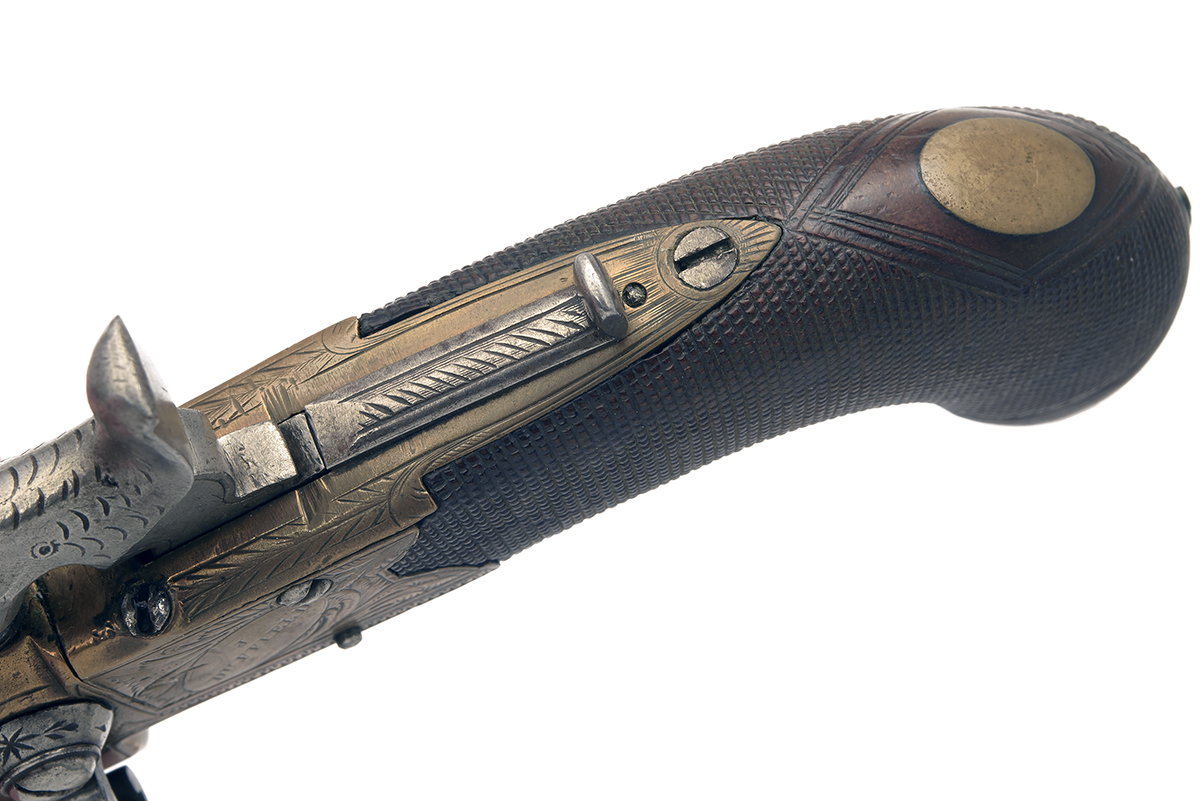 circa 1830, with blued plain turn-off 1 1/2in. Birmingham proved barrels (frozen), engraved band at muzzles and with false rifling for turn-off key (absent), borderline and acanthus leaf engraved brass action with central hammer, tap-handle and signature to left side, finely chequered bag-shaped walnut butt with lion mask butt-cap and concealed automatic trigger