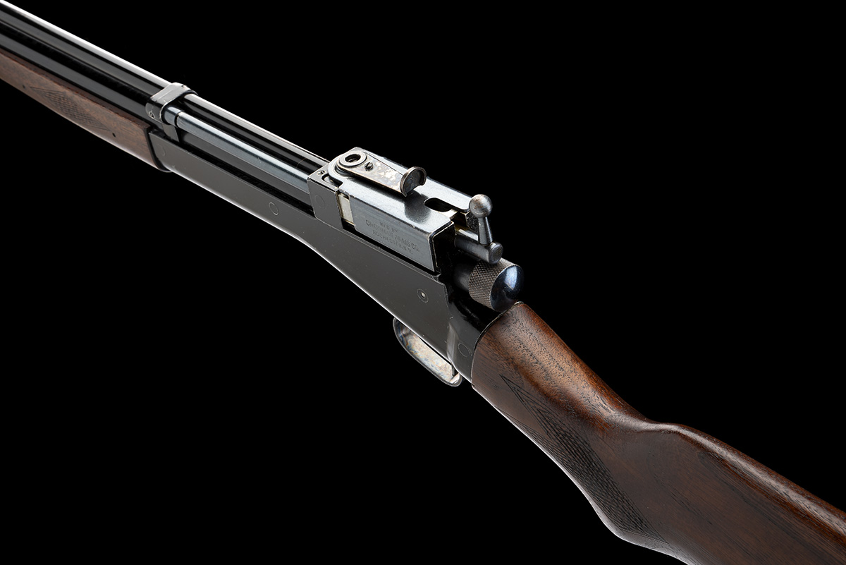 circa 1935, with black painted 20in. barrel, bolt action blued breech marked 'MFD BY CROSMAN ARMS CO. ROCHESTER N.Y. on the left side and 'CROSMAN .22 PAT. OCT. 28 1924, OTHER PATENTS PENDING' and fitted with ten-shot tube magazine, black painted alloy receiver, knurled cocking piece to rear, peep-sight to top of breech, wood semi pistol-grip butt-stock with colour-hardened heel-plate, chequered wood fore-arm, the whole retaining the majority of its factory finish and generally in collector's external condition