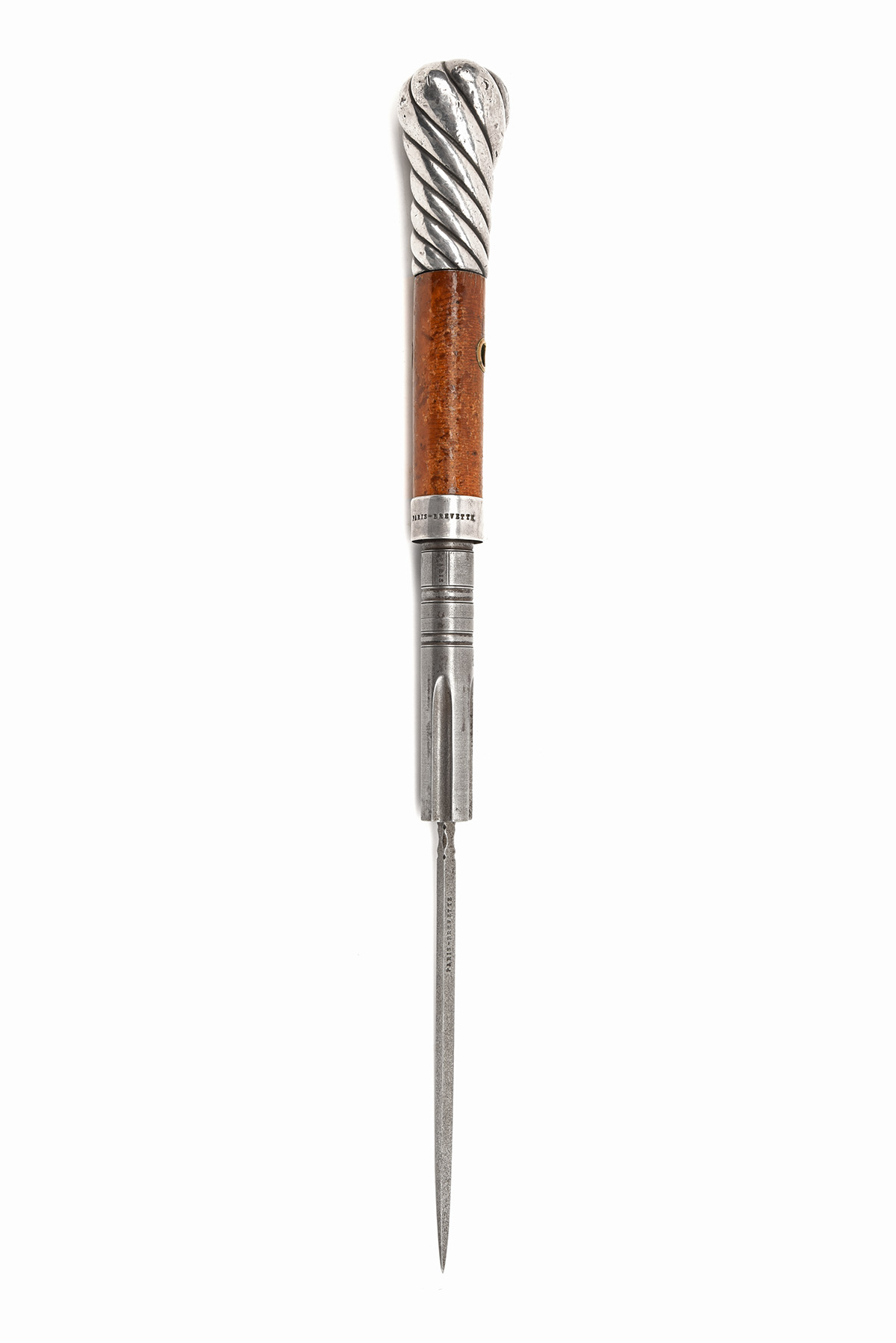 French, circa 1845, with fluted 2 1/2in. Liege-proved barrel-group, the front mounted with a square-section thrusting dagger with 5 1/2in. blade signed 'PARIS-BREVETTE', the barrel group pulling forwards against a spring revealing a small nipple and locking on a bar trigger, the body marked 'PARIS', cane-covered handle bored through with a lanyard aperture and fitted with white metal mounts, the front mount signed 'PARIS-BREVETTE' and with button trigger, the weighted pommel of twist design swelling at the top, the whole inserting into the cane shaft with brass tip
