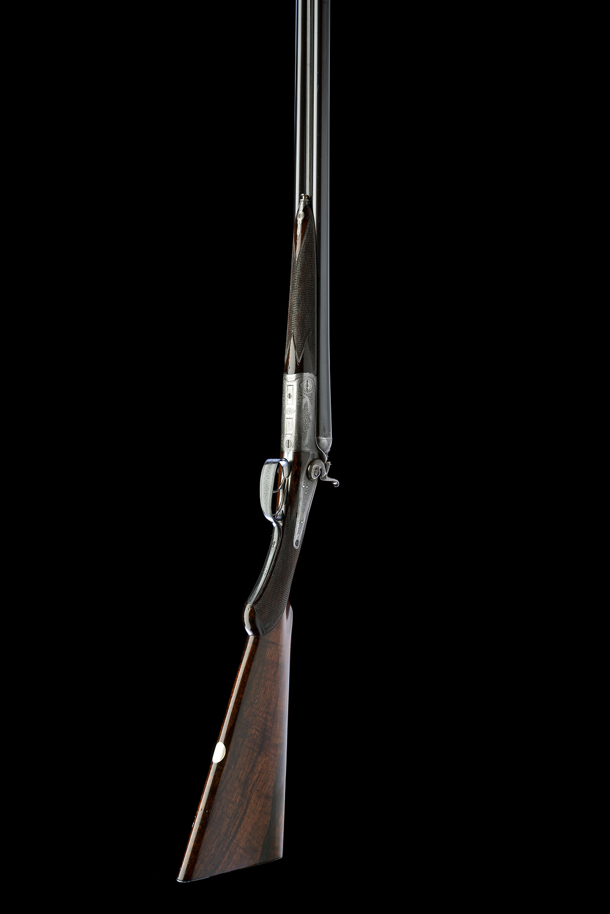 circa 1890, 28in. sleeved steel to damascus barrels, rib engraved 'W.R. LEESON. ASHFORD. KENT.', 2 1/2in. chambers, bored approx. imp. cyl. and 3/4 choke, carved percussion fences, rebounding locks, beaded border and partial acanthus scroll engraving, retaining traces of original colour-hardening and finish, 14 1/2in. figured semi-pistolgrip stock with steel heel and toe plates, weight 5lb. 15oz.