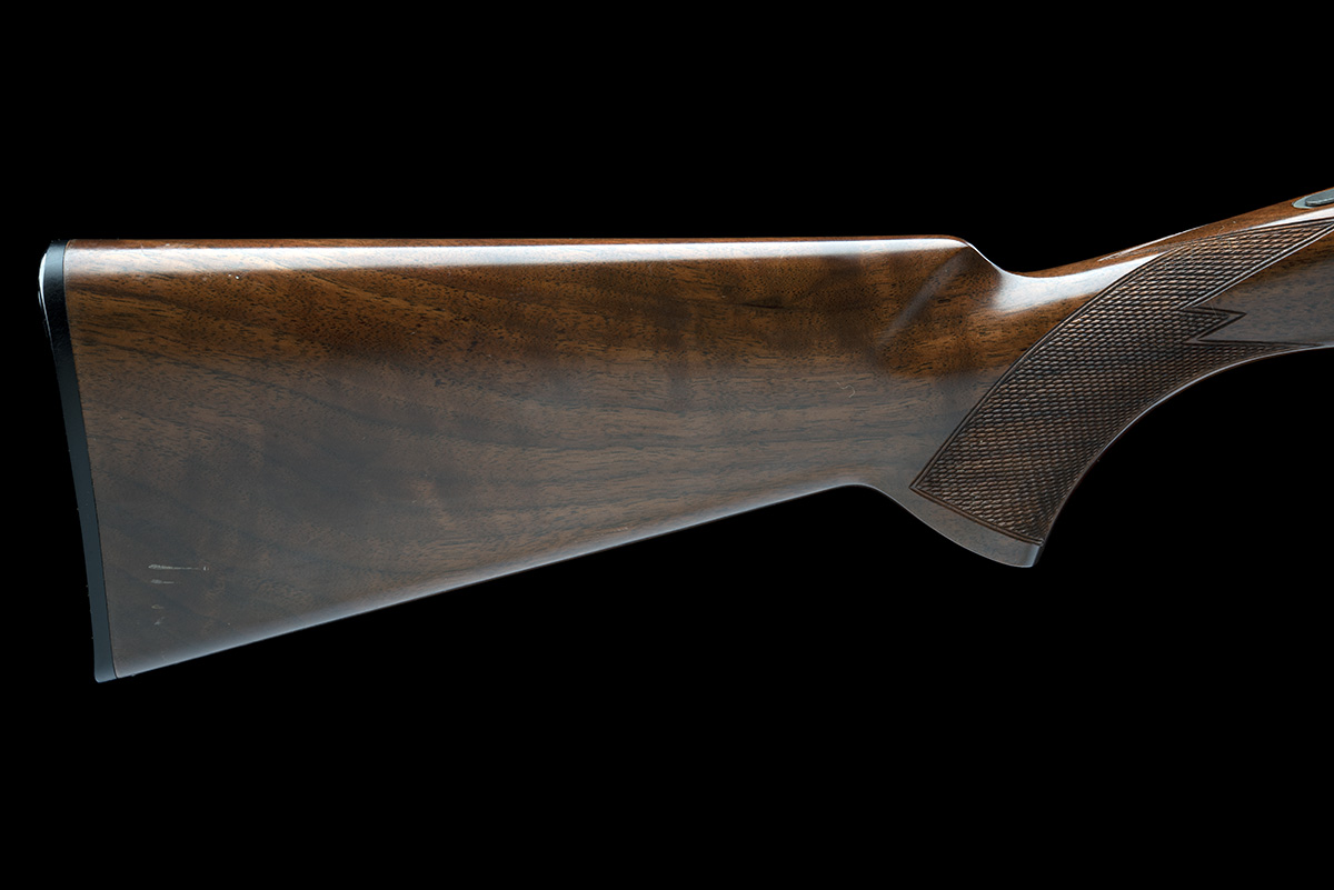 for 2000, 30in. nitro reproved barrels with 6mm ventilated matt top-rib, 3in. chambers, bored approx. 1/4 and 1/2 choke, hold-open toplever, automatic safety with integral barrel selector switch, floral and scroll engraving, the sides with game scenes of pointer and duck in a wetland setting to the left and pointer and partridge to the right, satin finish, 14in. pistolgrip stock including trademarked buttplate, weight 6lb. 7oz.