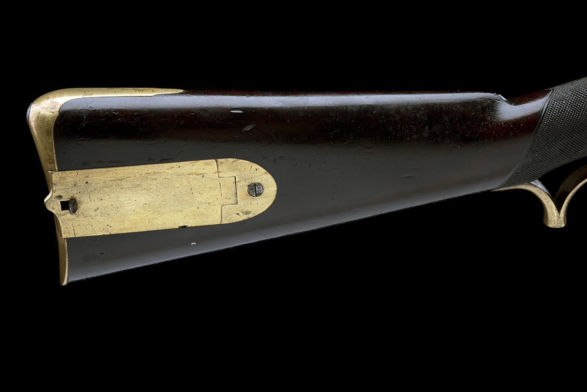 with 30 1/4in. iron twist barrel professionally rebrowned and having a gold-lined touch-hole, fitted with sword bayonet bar at muzzle, small blade front-sight, three leaf back-sight, the flat at the breech engraved with the makers name "WM. MOORE, RIFLE GUNMAKER 118 WHITE CHAPEL HIGH ST. LONDON" the barrel is rifled with 11 grooves, plain flat bevelled lockplate with stepped tail and bolt safety, the makers name "W. MOORE" set in a recess in a gold block to the centre, vee shaped rainproof pan and roller to frizzen spring, and swan-neck cock, the lock is detented and the rifle has a set trigger, brass-mounted full walnut stock with finely chequered wrist, and raised cheek-rest, the fore-end is of the slit pattern dating the rifle to after 1805, the mounts include scroll trigger-guard, rectangular patchbox and two rammer pipes, the rifle is fitted with its original adjustable peep-sight and complete with its sling swivels and rammer. The stock with an old and expertly executed repair to the stock by the lock.