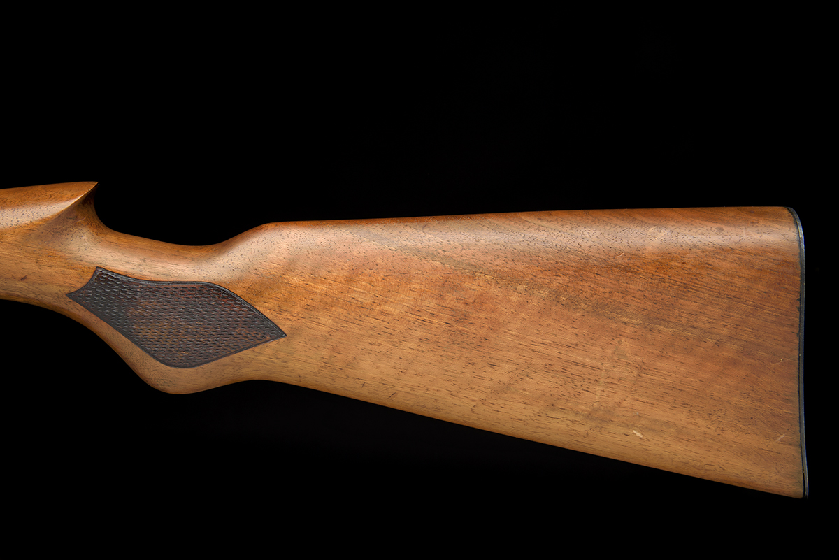 circa 1935, with expertly refinished 19in. barrel, dove-tailed fore-sight, elevating notch rear-sight, plain air-chamber marked 'HAENAL MODEL IV E', trigger unit with 'Haenel' trade-mark to top, chequered walnut saw-handled half pistol-grip butt-stock with iron heel-plate, cast trigger guard with adjuster, no provision for fore-end and push-button release under-lever