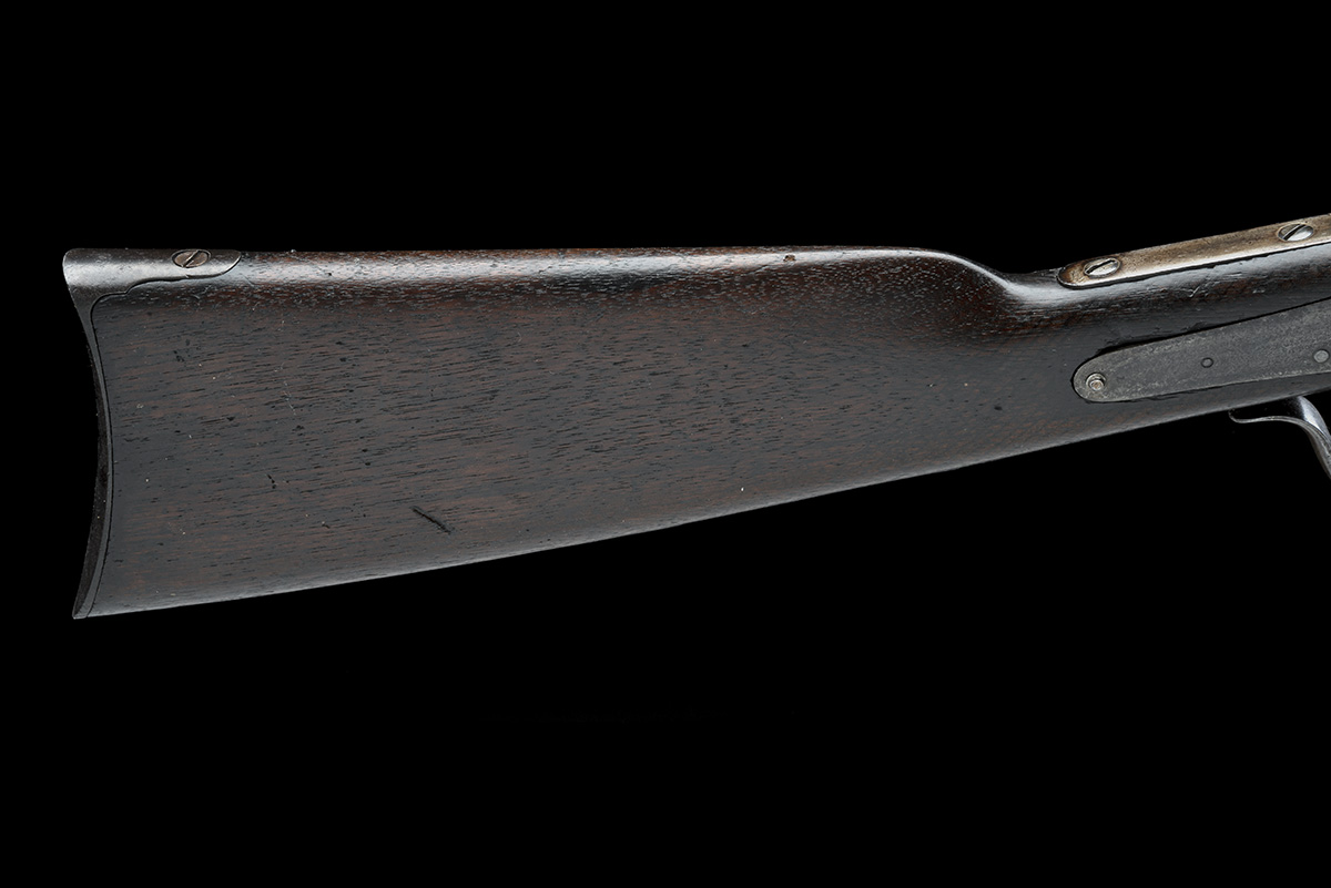 with 21in. barrel fitted with pinched blade front-sight, and leaf battle rear-sights to 500 yards, the breech top stamped 'BURNSIDE PATENT / MODEL OF 1864', (faint), interestingly although marked "Model of 1864" deliveries started in 1863 and this is one of the early deliveries from that year, breech block and action stamped with the serial number 6954, and for the convenience of the trooper a side-rib is fitted to the left-side of the action, back-action lock stamped in small letters 'BURNSIDE RIFLE CO. / PROVIDENCE R.I.', (faint), two piece iron mounted walnut stock, the splinter fore-end with one spring retained band, the butt with crescent butt-plate