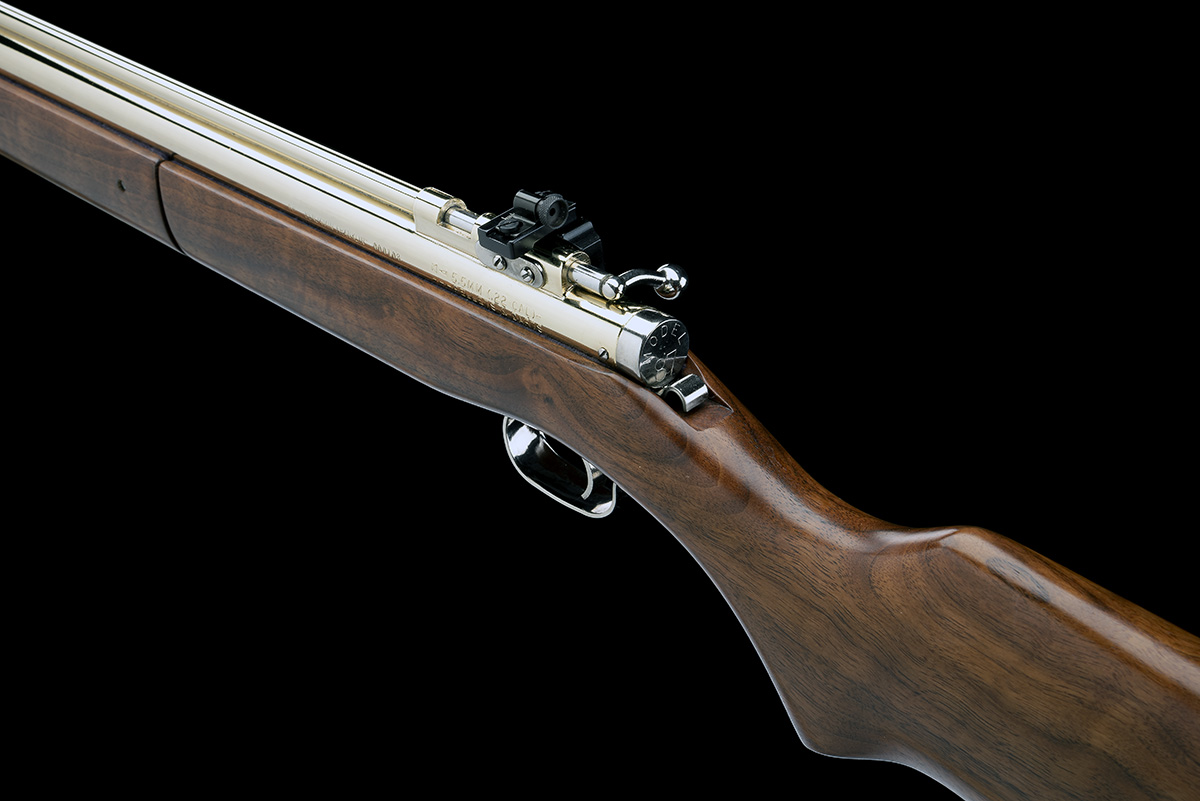 manufactured by the Benjamin Air Rifle Company for the proclaimed 100th anniversary of the firm in 1987, with gilt-washed brass 19in. barrel, blade fore-sight, gilt-washed brass bolt-action receiver fitted with a 'Williams' peep-sight, gilt washed brass pump-housing, figured plain American walnut butt-stock and fore-end, gilt washed furniture, appearing unused in its special padded sleeve with papers