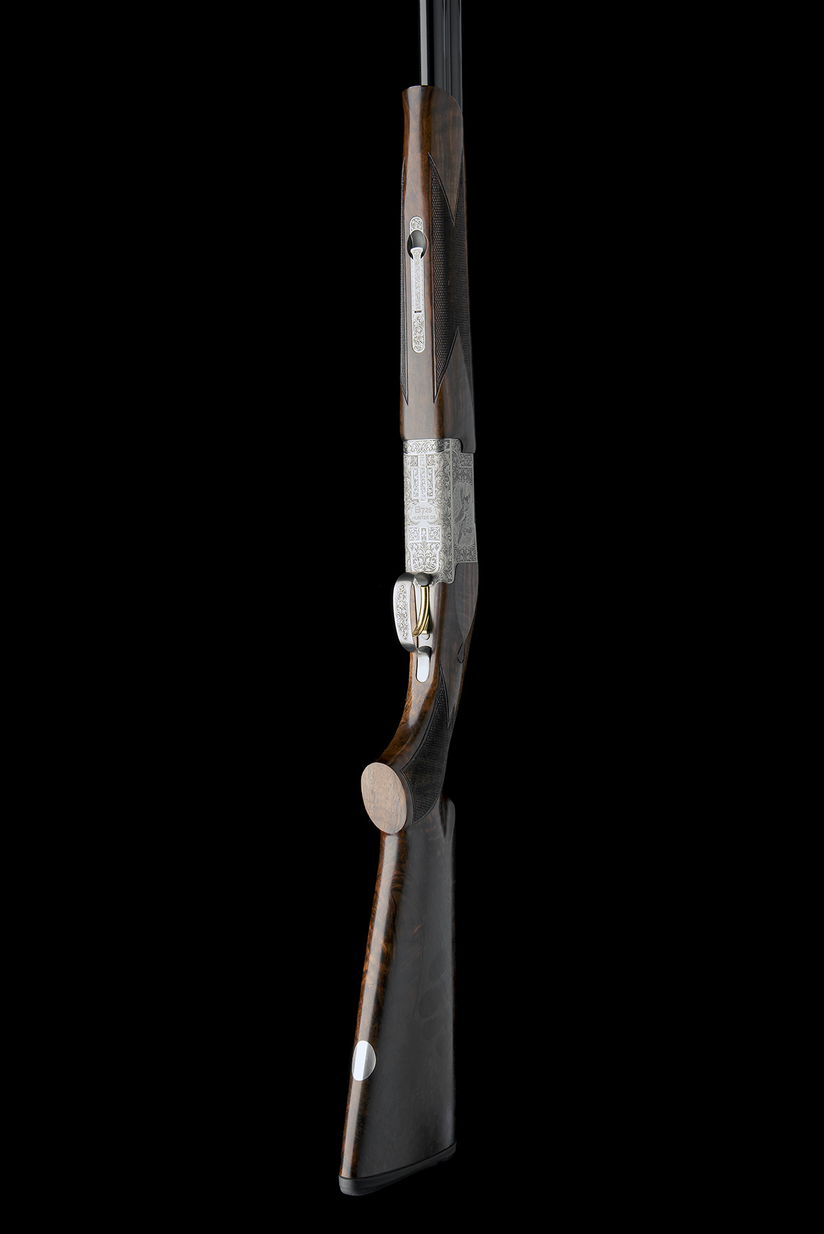 for 2015, 30in. nitro reproved barrels with 6mm ventilated matt top-rib, 3in. chambers, multichokes (with spares), hold-open toplever, manual safety with integral barrel selector switch, gold-washed trigger, bold acanthus scroll engraving on a matted background surrounding game scenes of pheasant and duck, matt silver finish, 14 3/4in. figured pistolgrip stock including 3/8in. rubber recoil pad, weight 7lb. 7oz., in its universal case