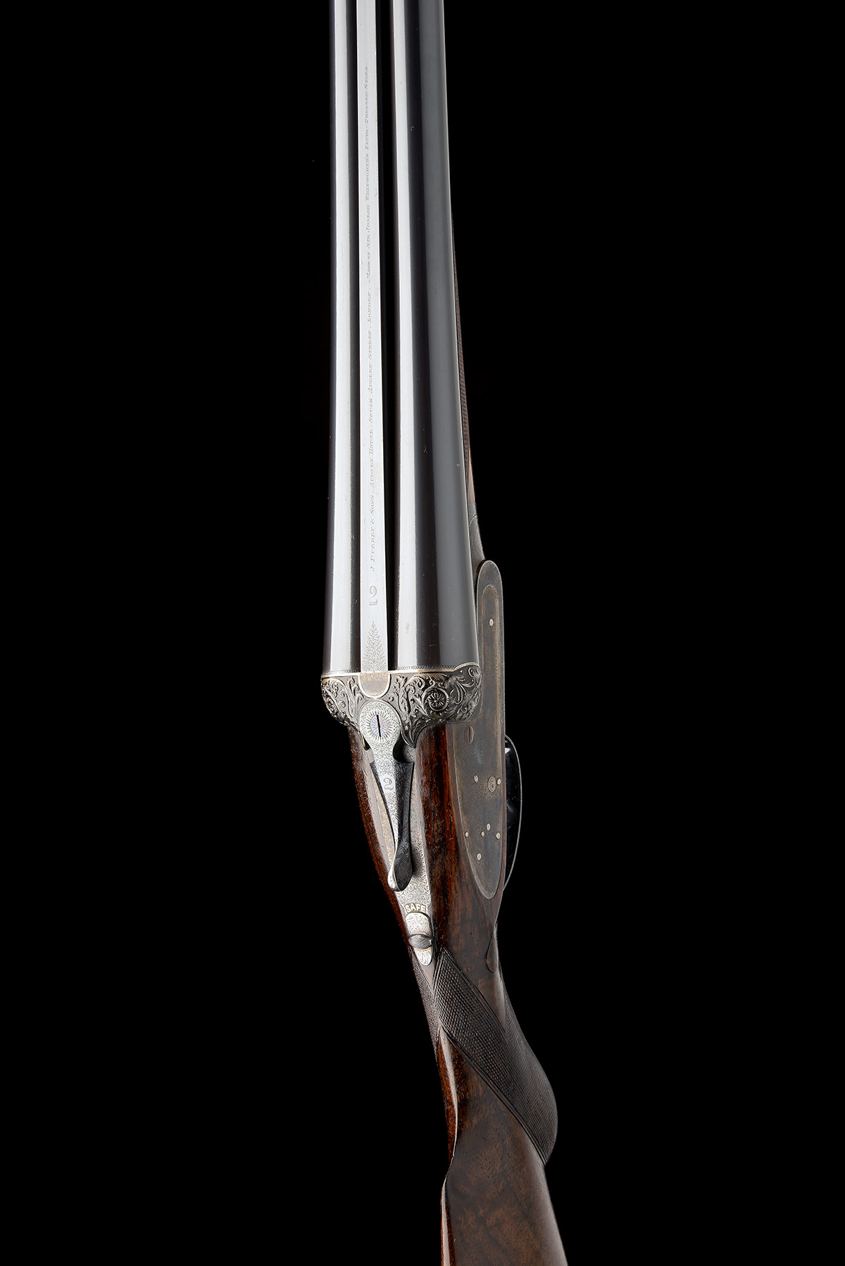 for 1894, 32in. nitro reproved Whitworth-steel chopperlump barrels with broad tapered rib engraved 'J. PURDEY & SONS. AUDLEY HOUSE. SOUTH AUDLEY STREET. LONDON. MADE OF SIR JOSEPH WHITWORTH'S FLUID-PRESSED STEEL', the breech end engraved '2' and with acanthus scroll detailing, 3in. chambers, bored approx. 3/4 and 1/2 choke, large treble-grip action with hidden third bite and side-clips, removable striker discs, toplever engraved '2', automatic safety with gold-inlaid 'SAFE' detail, arrow cocking-indicators, the fences carved in high relief with stylised floral motifs on a matted background, best fine acanthus scroll engraving with floral bouquets, retaining much original colour-hardening and finish, 14 3/4in. well-figured semi-pistolgrip stock (with well executed likely contemporary conversion to pistolgrip), weight 8lb., in its brass-cornered oak and leather guncase.