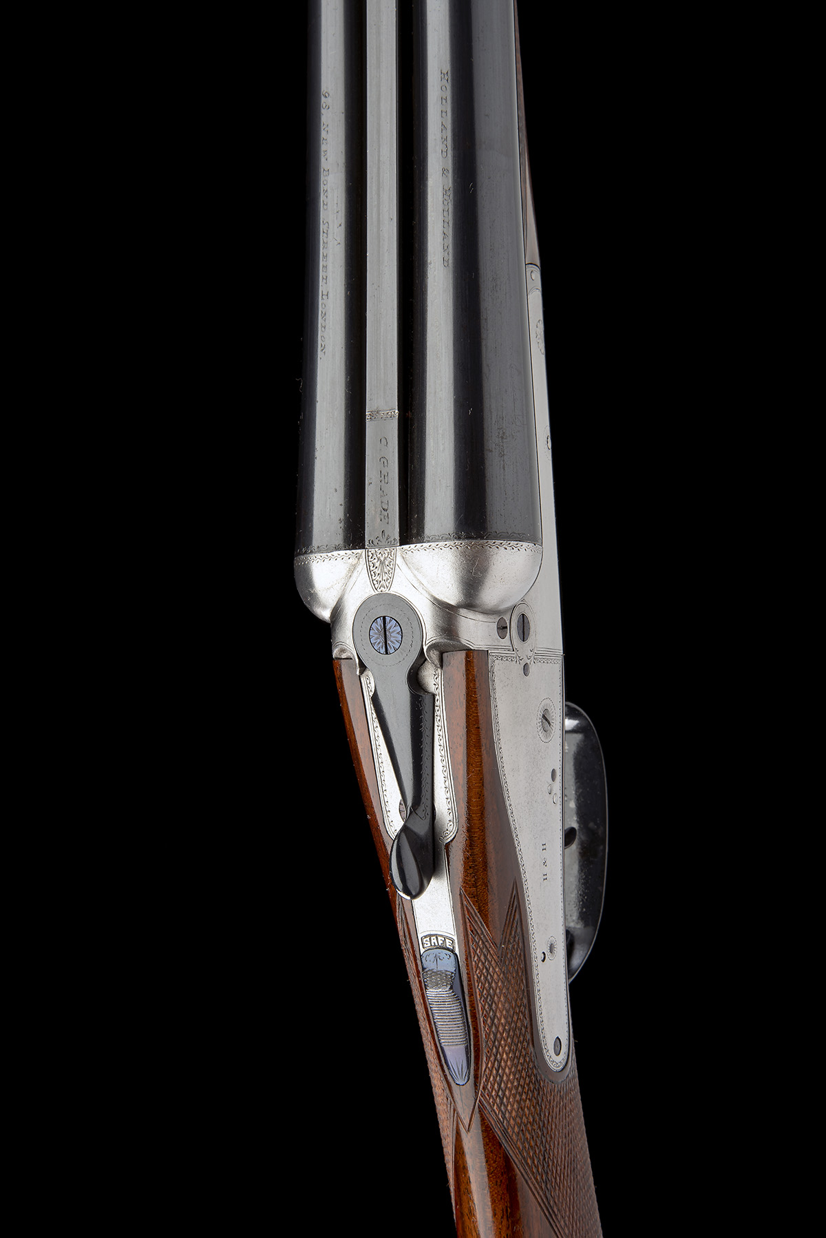 circa 1910, 28in. sleeved nitro barrels (in 2011), the tubes re-engraved 'HOLLAND & HOLLAND. 98. NEW BOND STREET. LONDON.', the rib re-engraved 'C GRADE' at the breech end, 2 3/4in. chambers, bored approx. true cyl. and 1/4 choke, action with patent gas checks, automatic safety with engraved 'SAFE' detail, cocking-indicators, border engraving, the lockplates signed 'H & H', brushed bright and reblued finish overall, 14 1/2in. replacement stock including 3/8in. buttplate, fore-end with Deeley & Edge patent release and replacement wood, weight 6lb. 13oz., in a leather hammergun case with Holland & Holland trade label